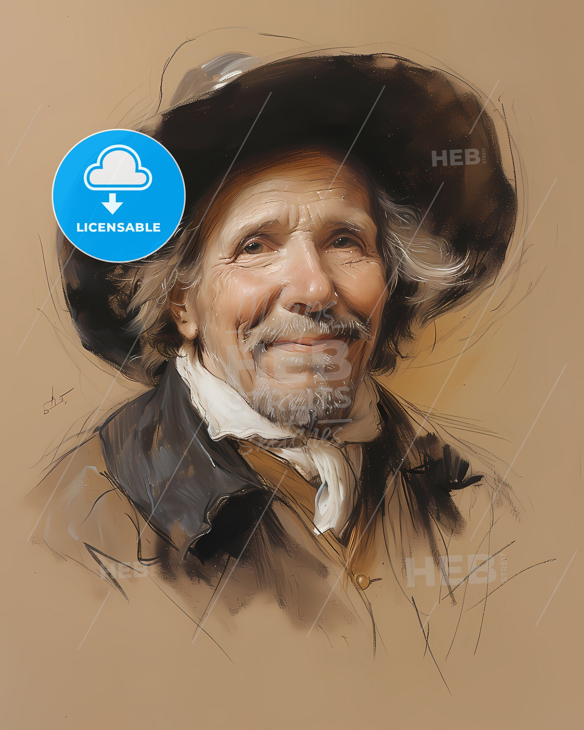 Portrait of John Comenius, 1592 - 1670, Philosopher and Educator, Moravian philosopher, considered a pioneer of modern education. - smiling. Vintage art illustration on bright beige paper background, sweeping overdrawn lines, subtile colored artwork, that captures the playful spirit and vivid imagination of modern art.
