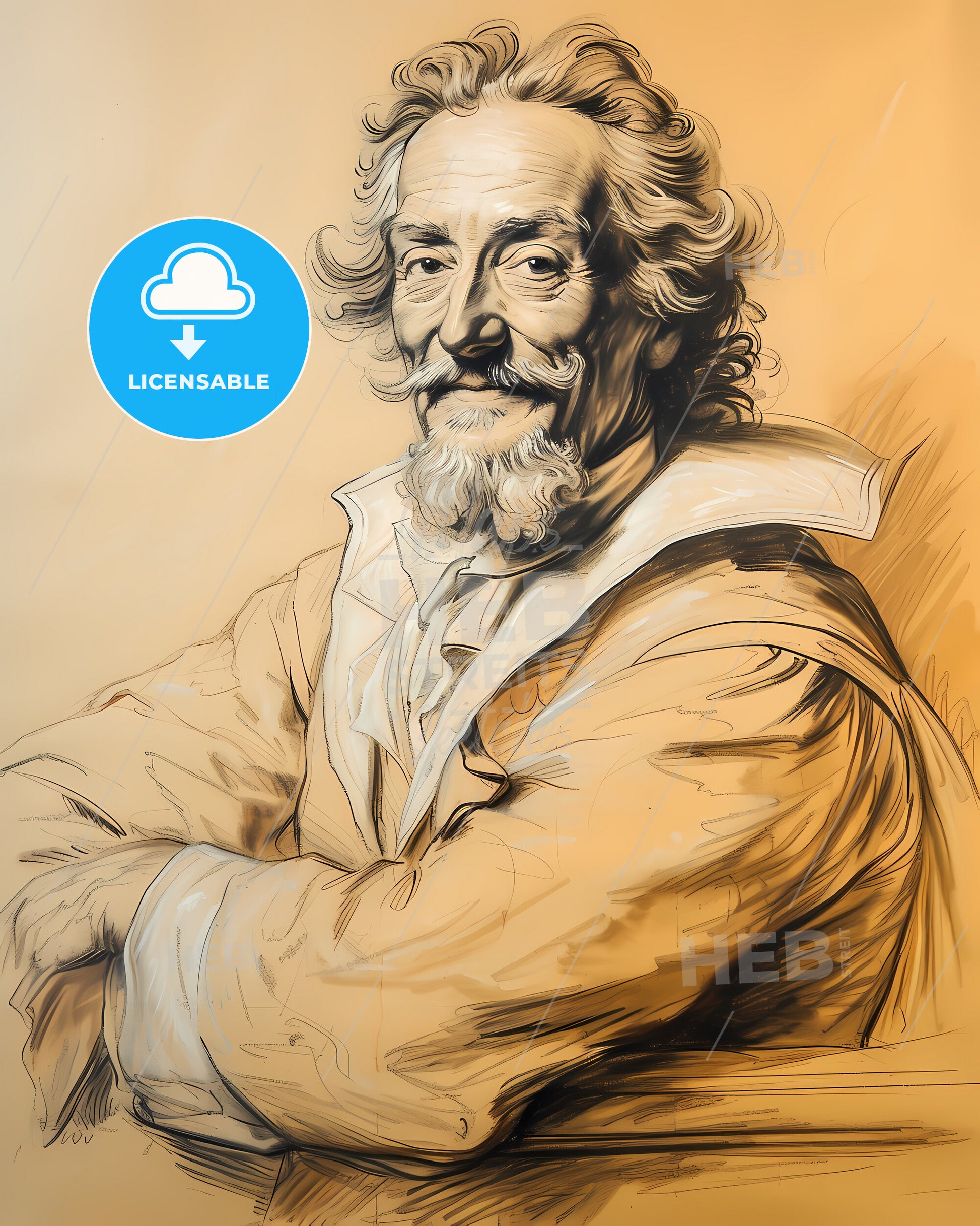 Portrait of John Milton, 1608 - 1674, Poet and Writer, Author of "Paradise Lost," one of the greatest epic poems in English literature. - smiling. Vintage art illustration on bright beige paper background, sweeping overdrawn lines, subtile colored artwork, that captures the playful spirit and vivid imagination of modern art.