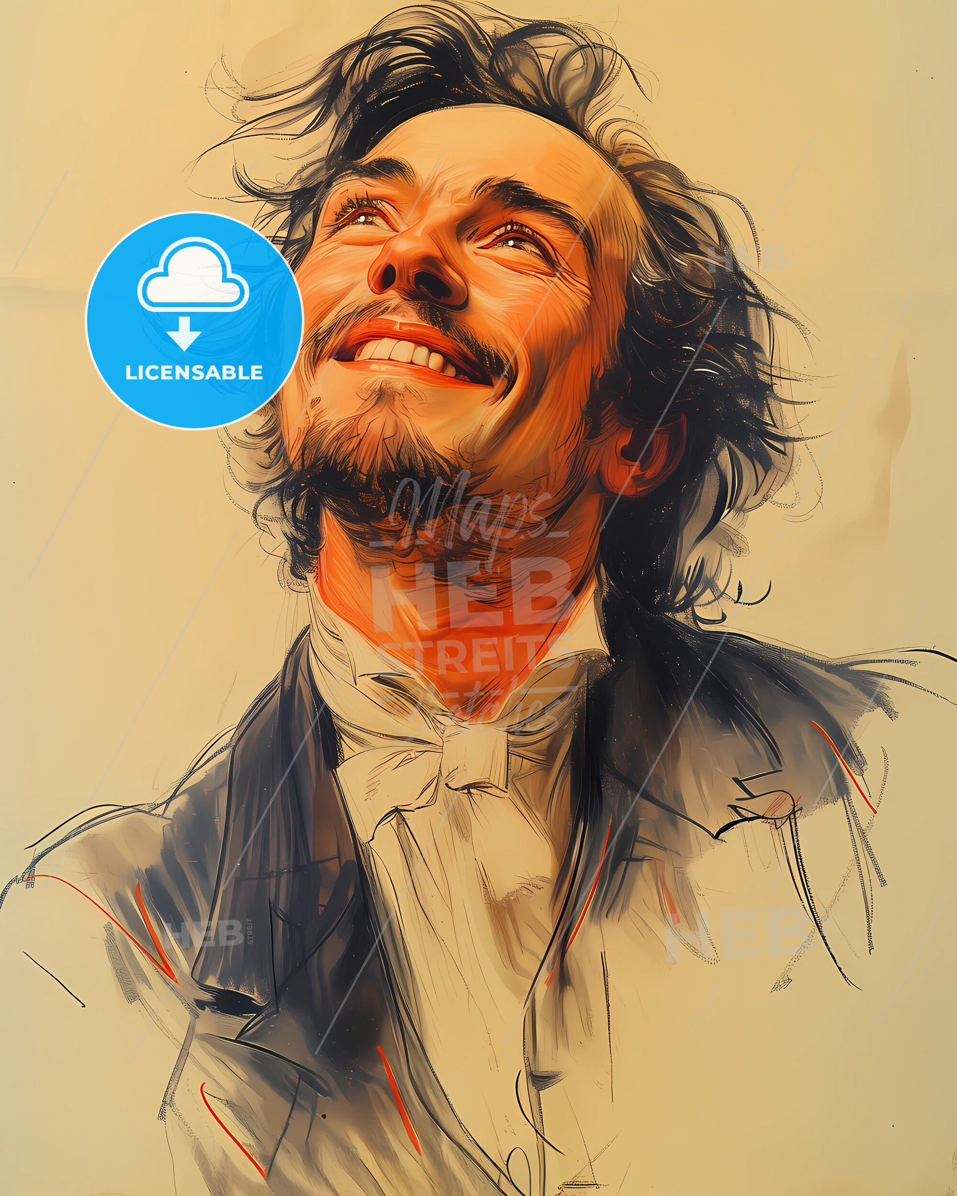 Portrait of Joseph Jefferson, 1829 - 1905, Actor, American actor, best known for his portrayal of Rip Van Winkle on the stage. smiling. Vintage art illustration on bright beige paper background, sweeping overdrawn lines, subtile colored artwork, that captures the playful spirit and vivid imagination of modern art.