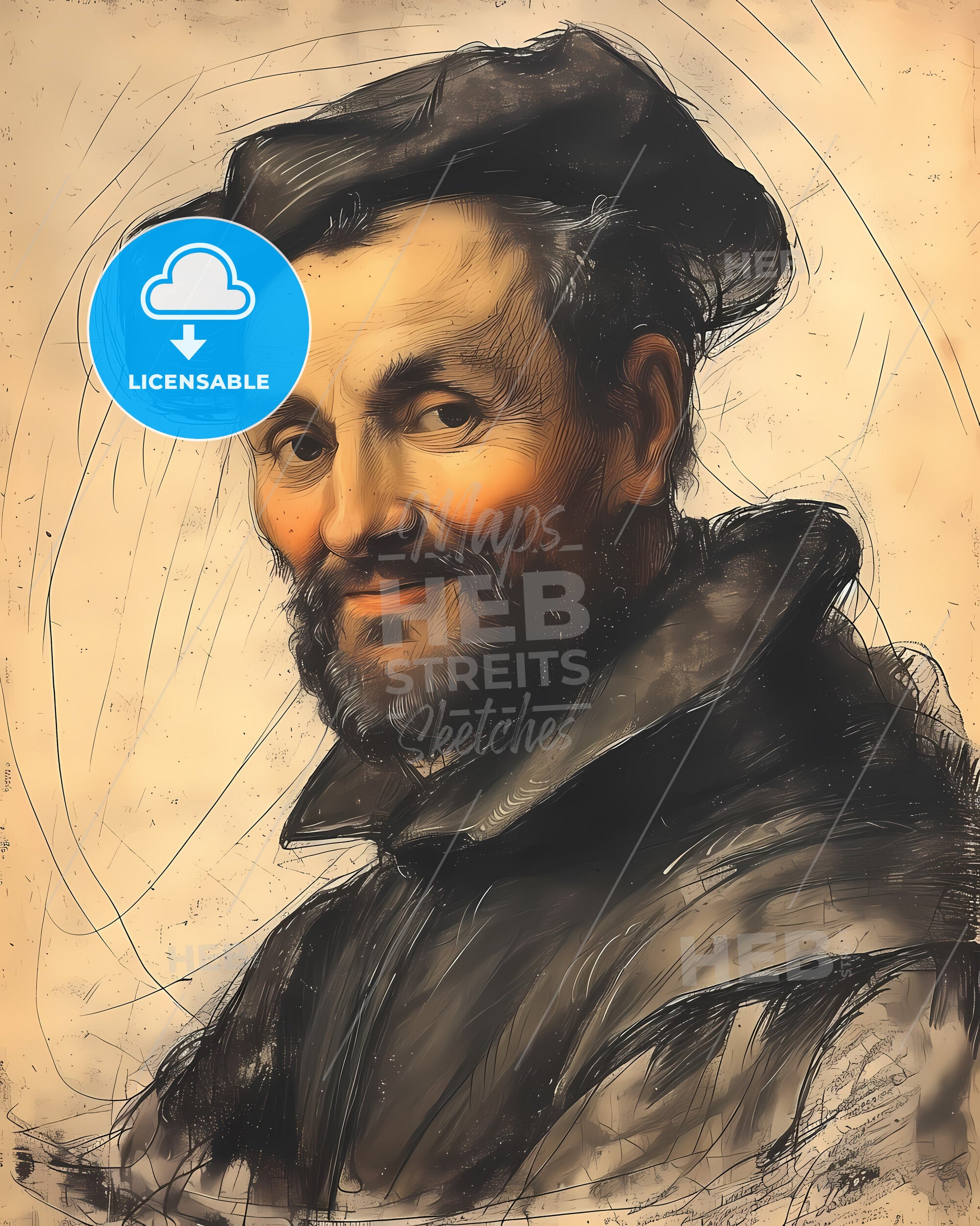 Portrait of Juan RodrÍguez Cabrillo, 1499 - 1543, Explorer - smiling. Vintage art illustration on bright beige paper background, sweeping overdrawn lines, subtile colored artwork, that captures the playful spirit and vivid imagination of modern art.