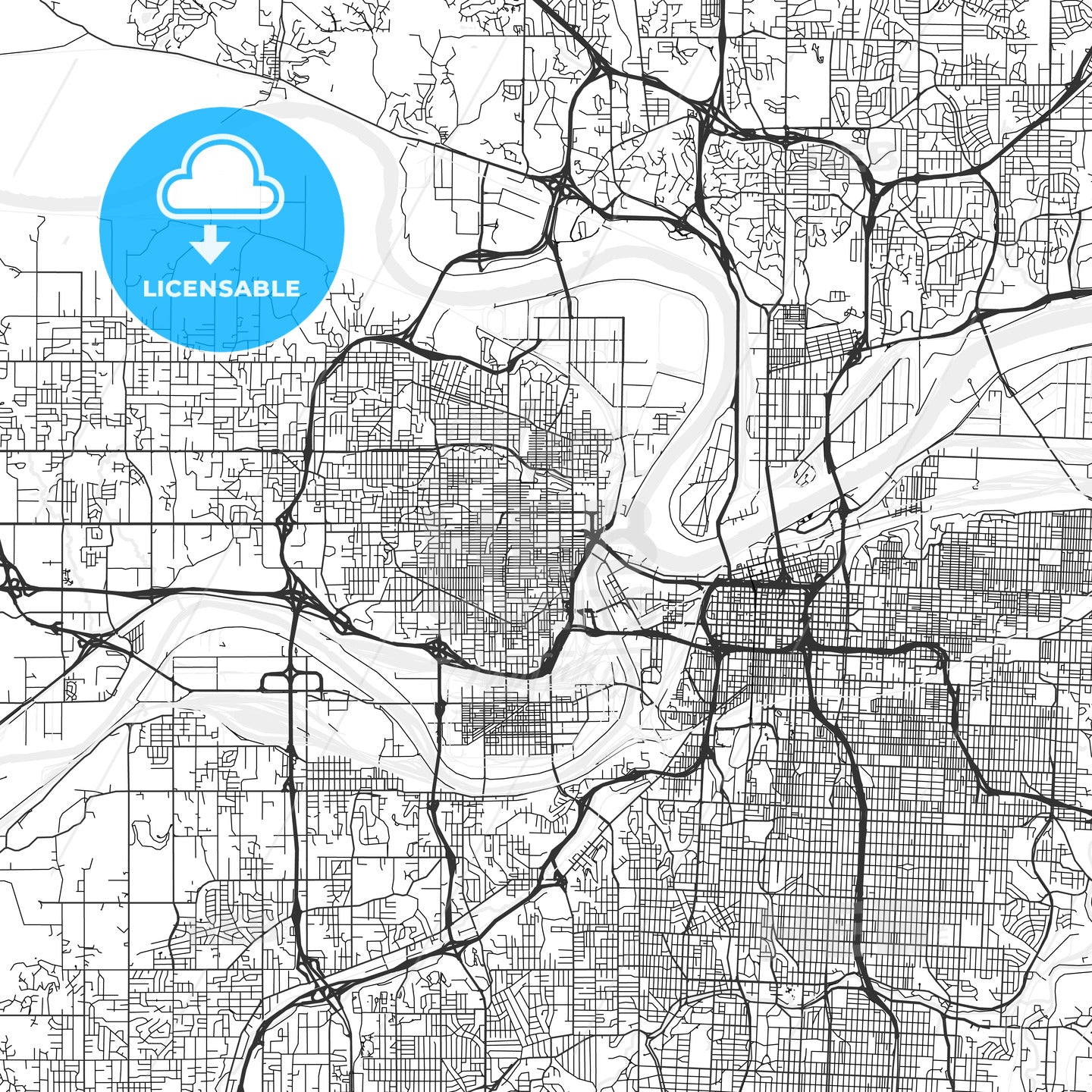Kansas City downtown and surroundings Map in light shaded version with many details for high zoom levels. This map of Kansas City contains typical landmarks with space for additional information and easy access to color changes.
