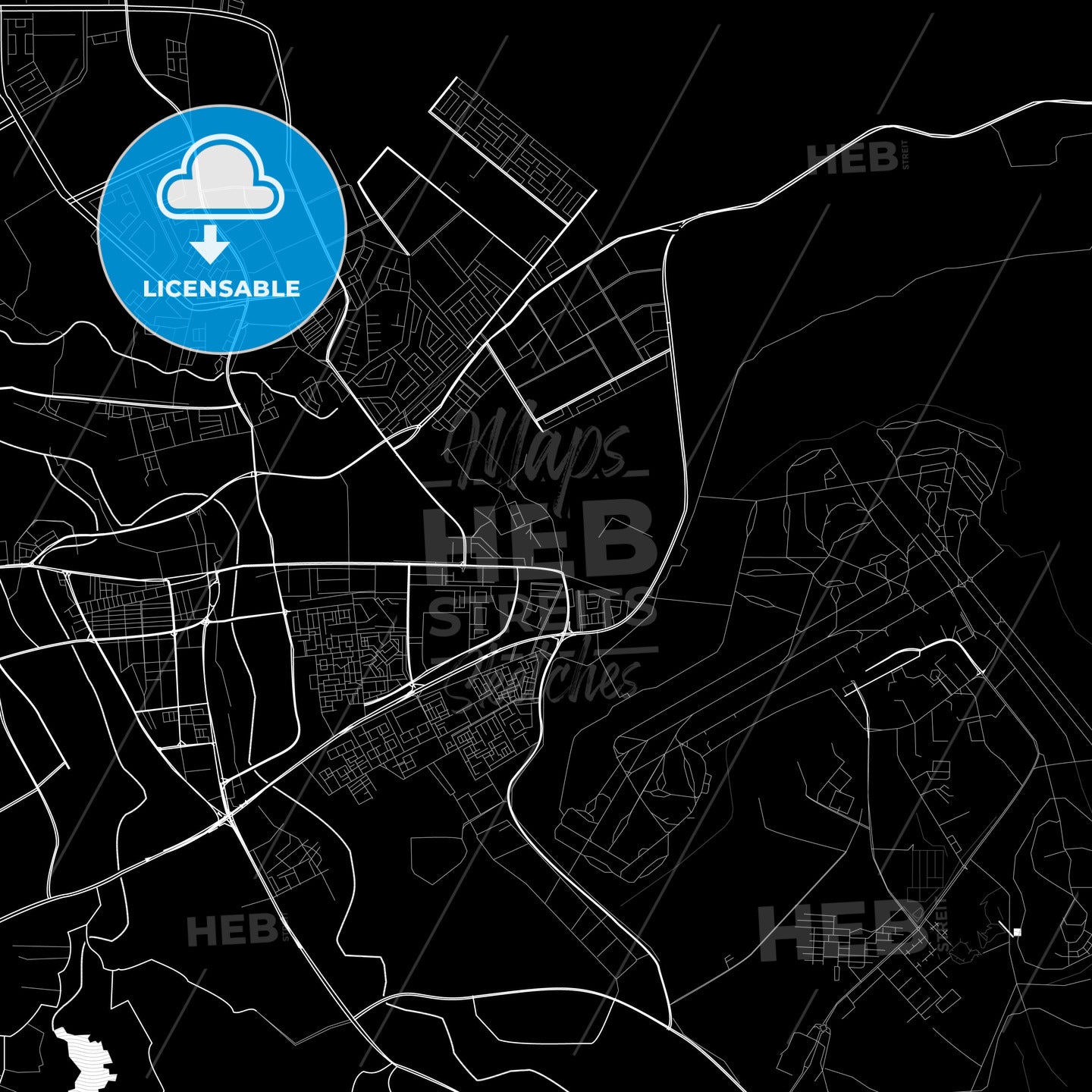 Black and white vector map of Khamis Mushayt, Saudi Arabia with fine structures and patterns for download. This printable map of Khamis Mushayt with major and minor roads has been carefully designed for all personal and professional needs. The pure PDF vector version of this map is fully scalable. Depending on our license, you can use this map for websites, marketing background and wall art.
