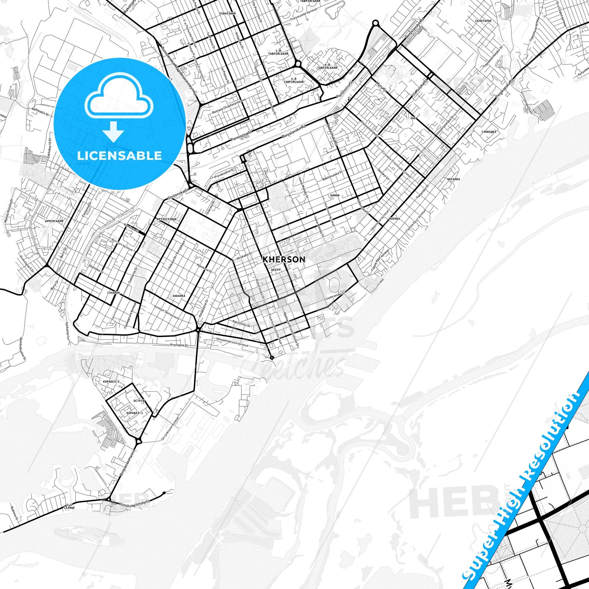 Kherson, Kherson Oblast, Ukraine in high-resolution, minimalist map designed for printed use. This detailed black and white map accurately highlights the street network and urban layout, making it an ideal ready-to-use map for your business.