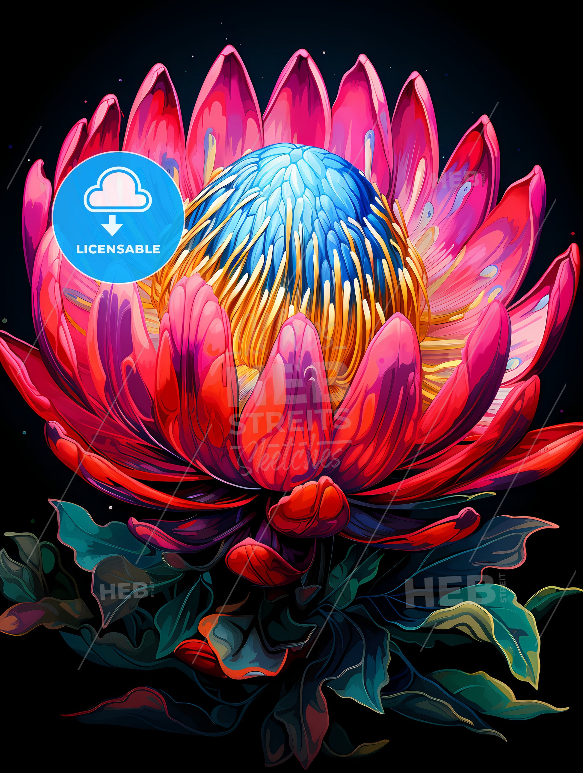 King Protea Isolated On Black Background Centre - a colorful flower with leaves