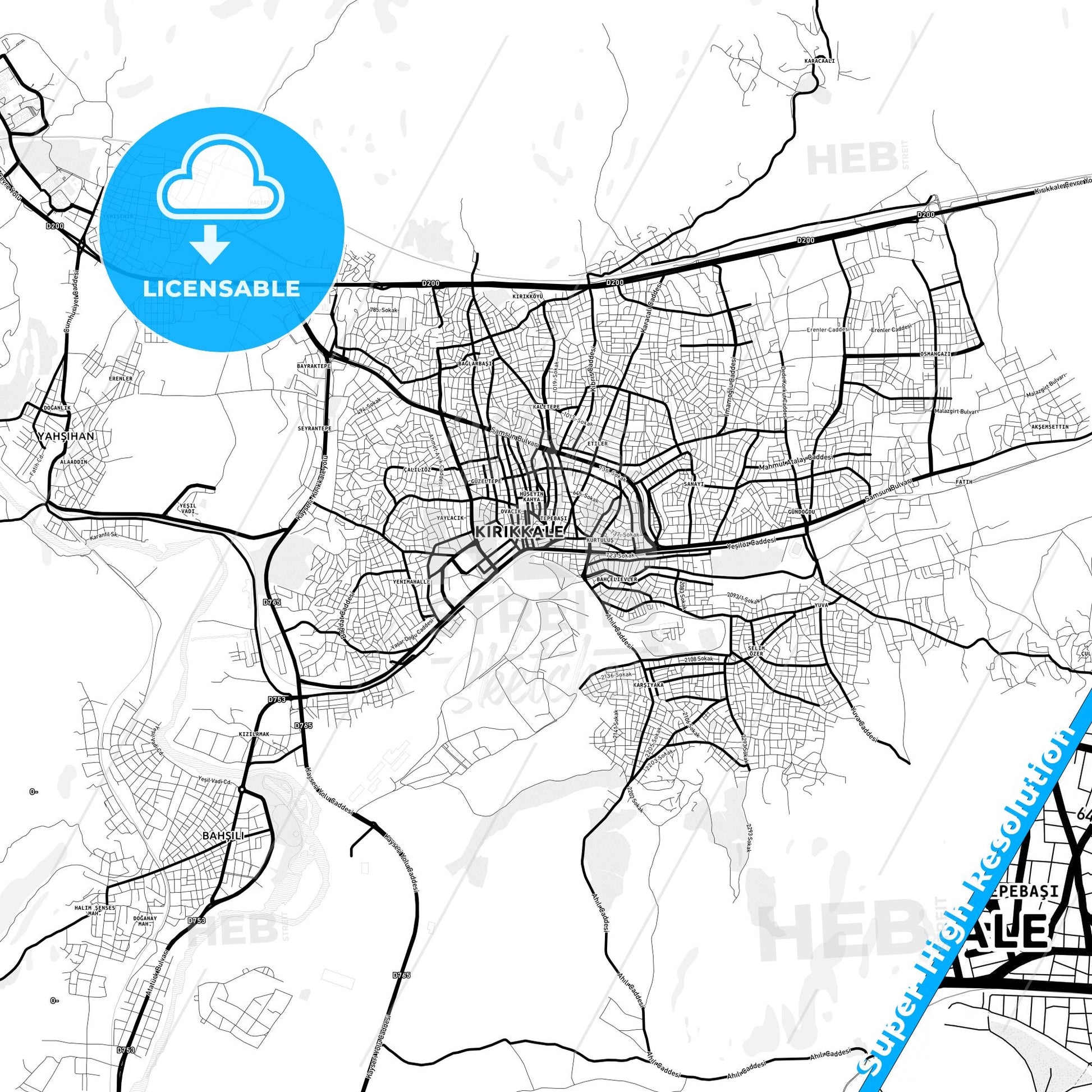 Kırıkkale, Kırıkkale, Turkey in high-resolution, minimalist map designed for printed use. This detailed black and white map accurately highlights the street network and urban layout, making it an ideal ready-to-use map for your business.