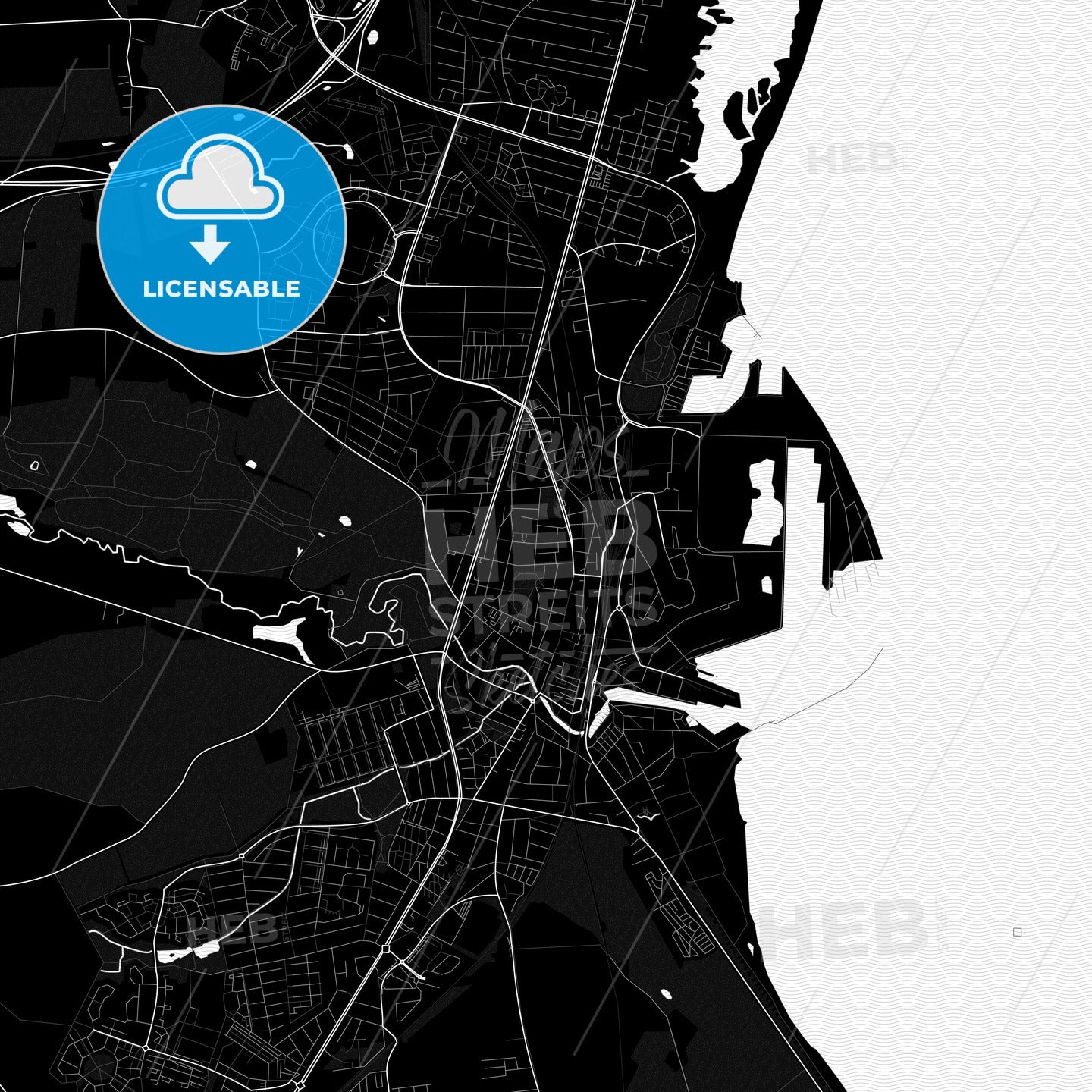 Black and white vector map of Køge, Denmark with fine structures and patterns for download. This printable map of Køge with major and minor roads has been carefully designed for all personal and professional needs. The pure PDF vector version of this map is fully scalable. Depending on our license, you can use this map for websites, marketing background and wall art.