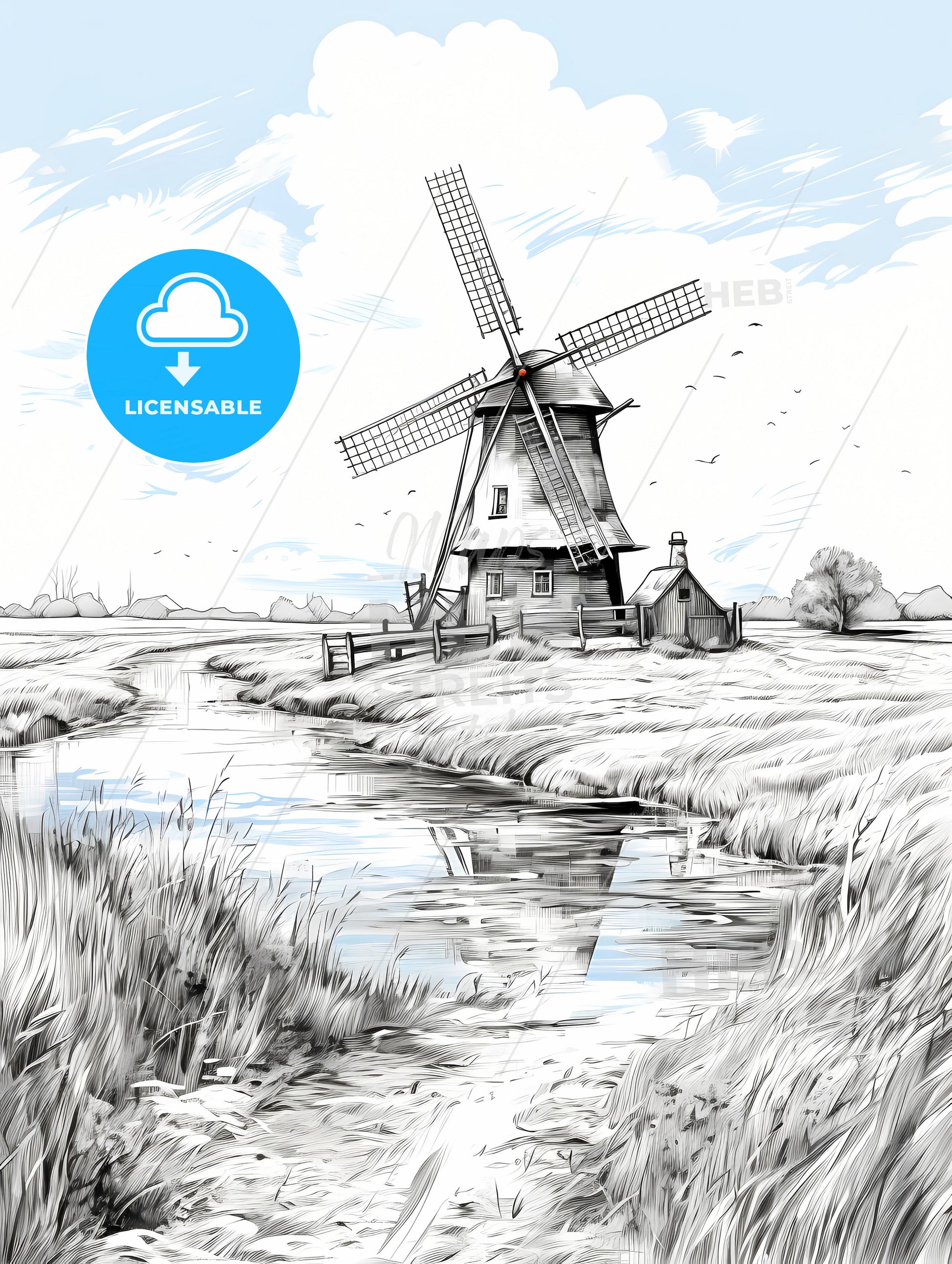 Landscape with windmill black and white