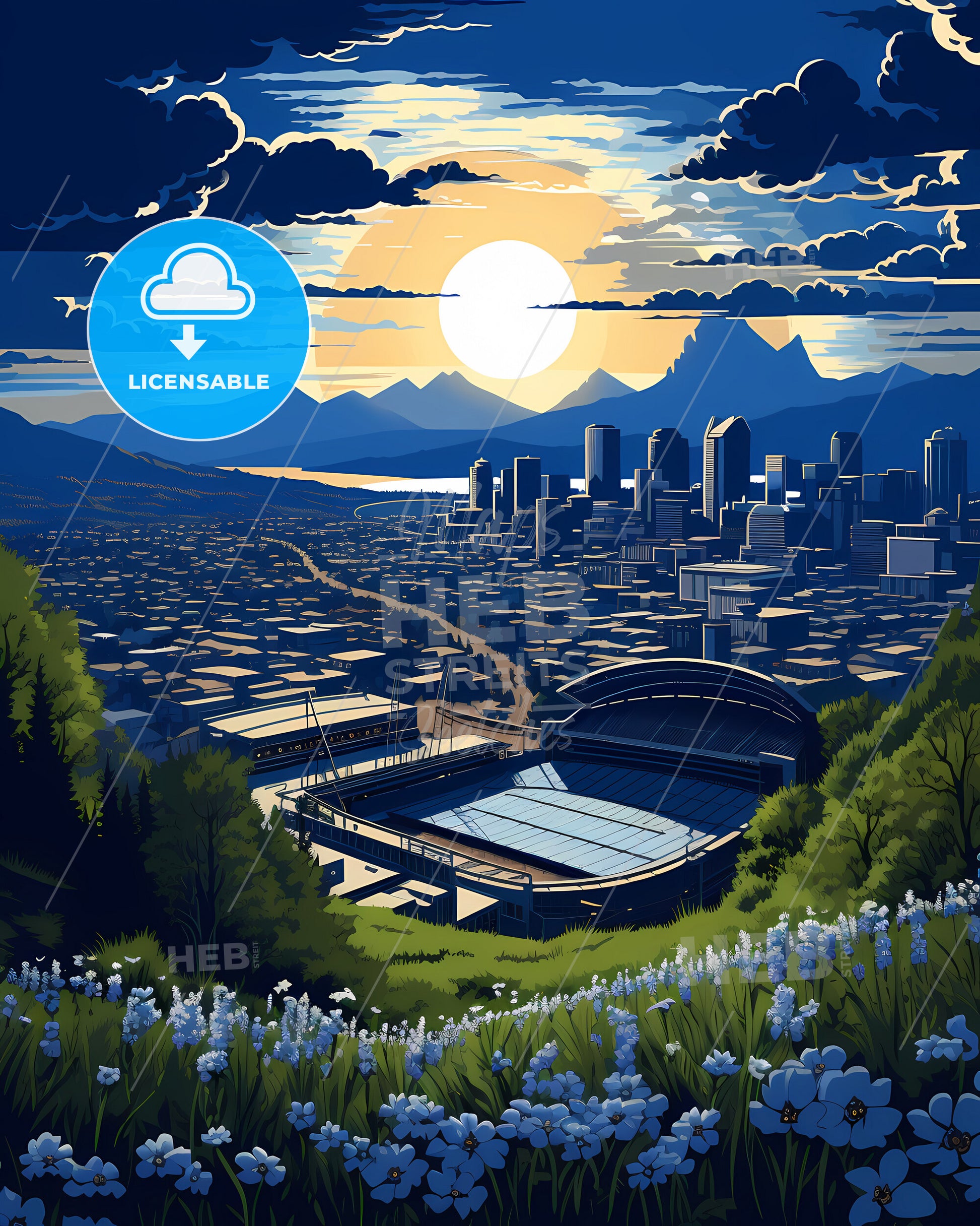 Layton, Utah, Skyline. art painting with blue sky some bright clouds in spring. in style of classic advertising illustration with nice gradients. Nice strokes and outlines that captures the playful spirit and vivid imagination of modern art.