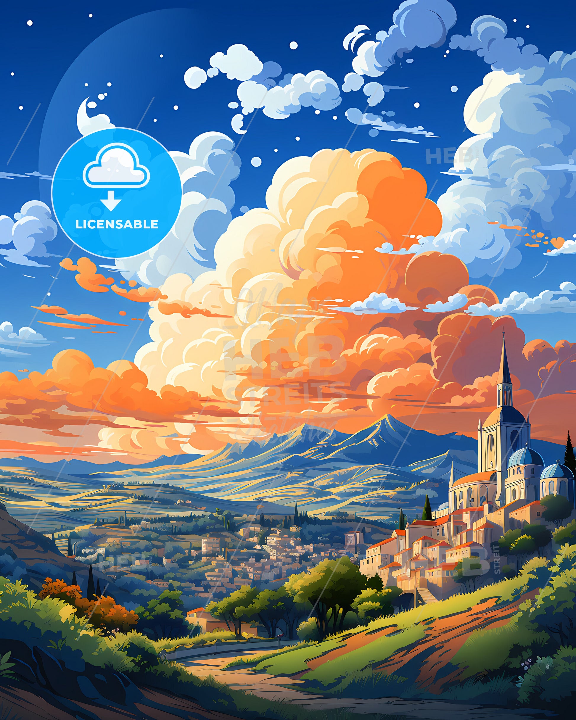 Leiria, Portugal, Skyline. art painting with blue sky some bright clouds in spring. in style of classic advertising illustration with nice gradients. Nice strokes and outlines that captures the playful spirit and vivid imagination of modern art.