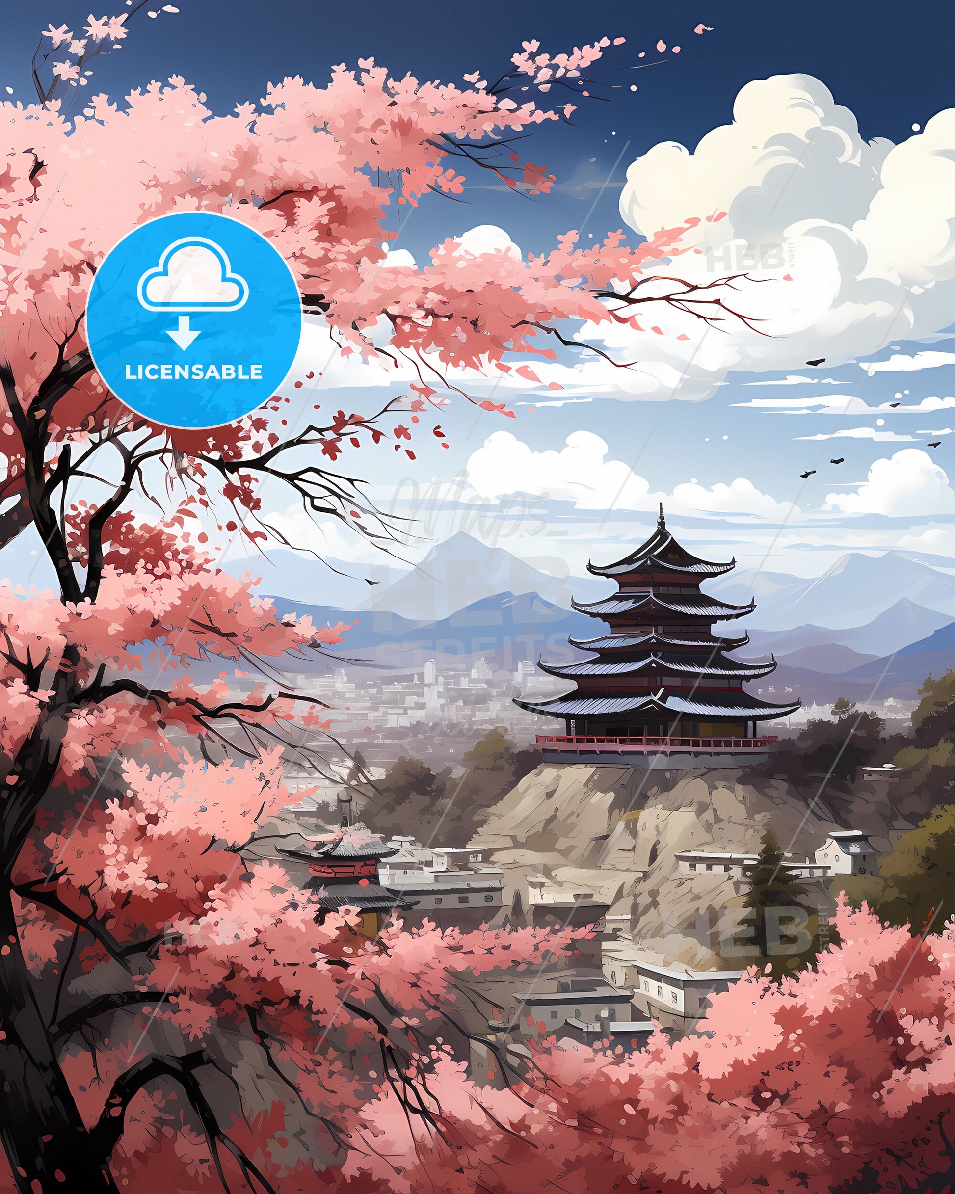 Liaocheng China Skyline. art painting with blue sky some bright clouds in spring. in style of classic advertising illustration with nice gradients. Nice strokes and outlines. Large area of copy space on top. litte bright sparkles