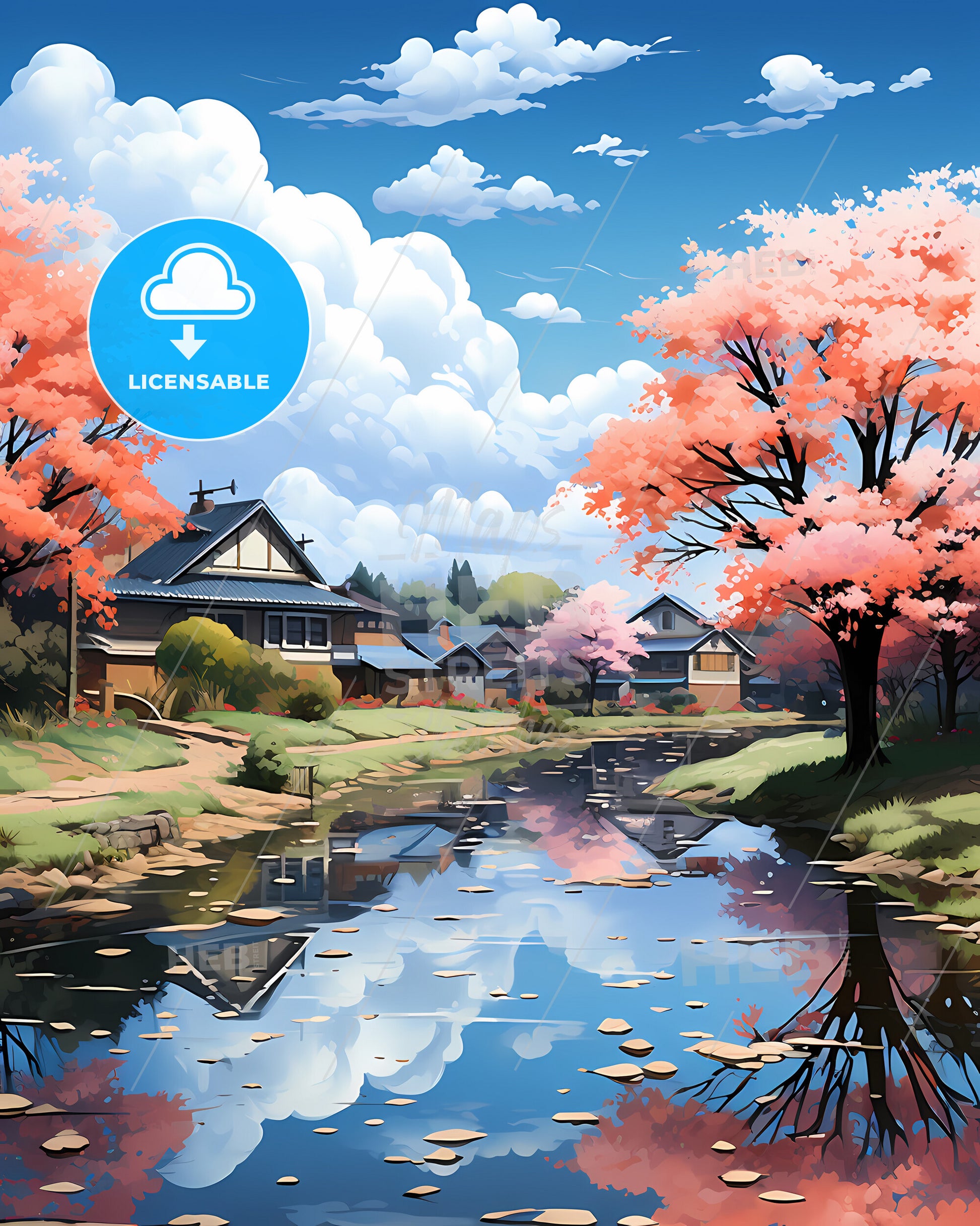 Lingewaard, Gelderland, Netherlands, Skyline. art painting with blue sky some bright clouds in spring. in style of classic advertising illustration with nice gradients. Nice strokes and outlines that captures the playful spirit and vivid imagination of modern art.