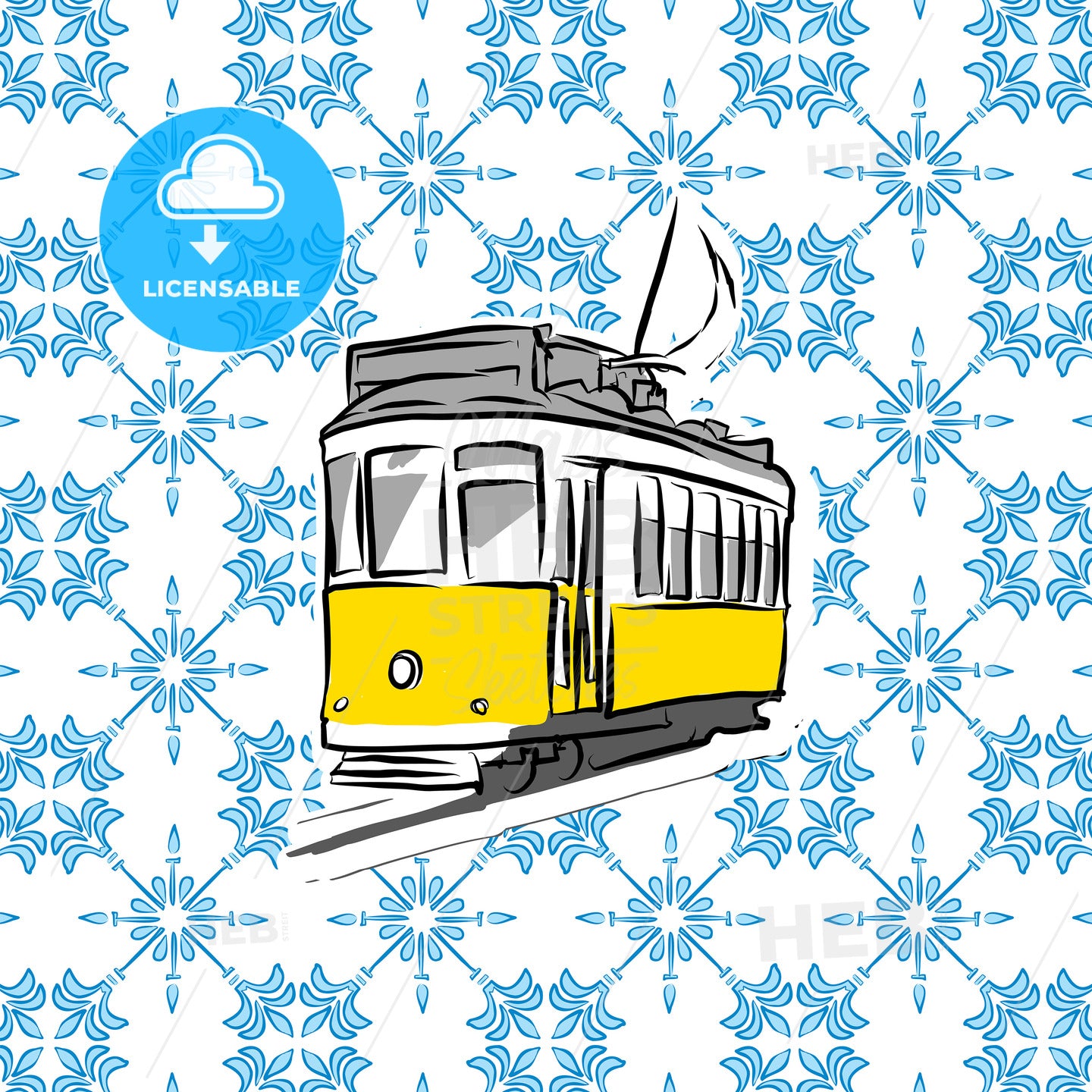Lisboa tram on blue background. Vector patterns abstract background for web backdrop, print, pillows, surface texture, wallpaper.
