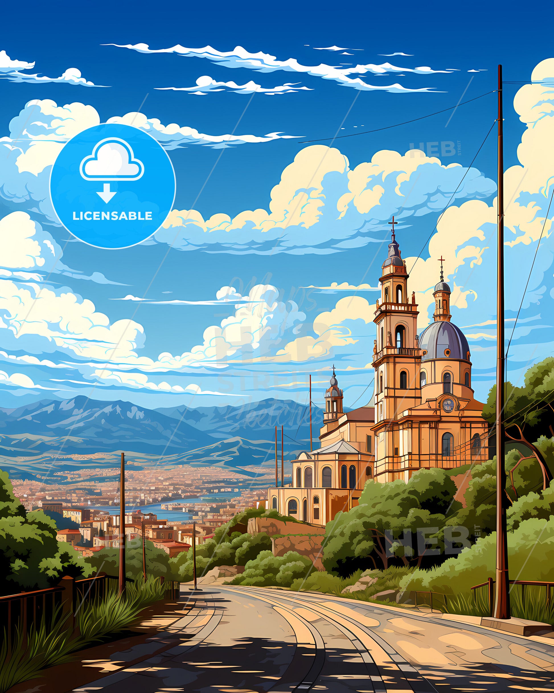 Livorno, Tuscany, Italy, Skyline. art painting with blue sky some bright clouds in spring. in style of classic advertising illustration with nice gradients. Nice strokes and outlines that captures the playful spirit and vivid imagination of modern art.