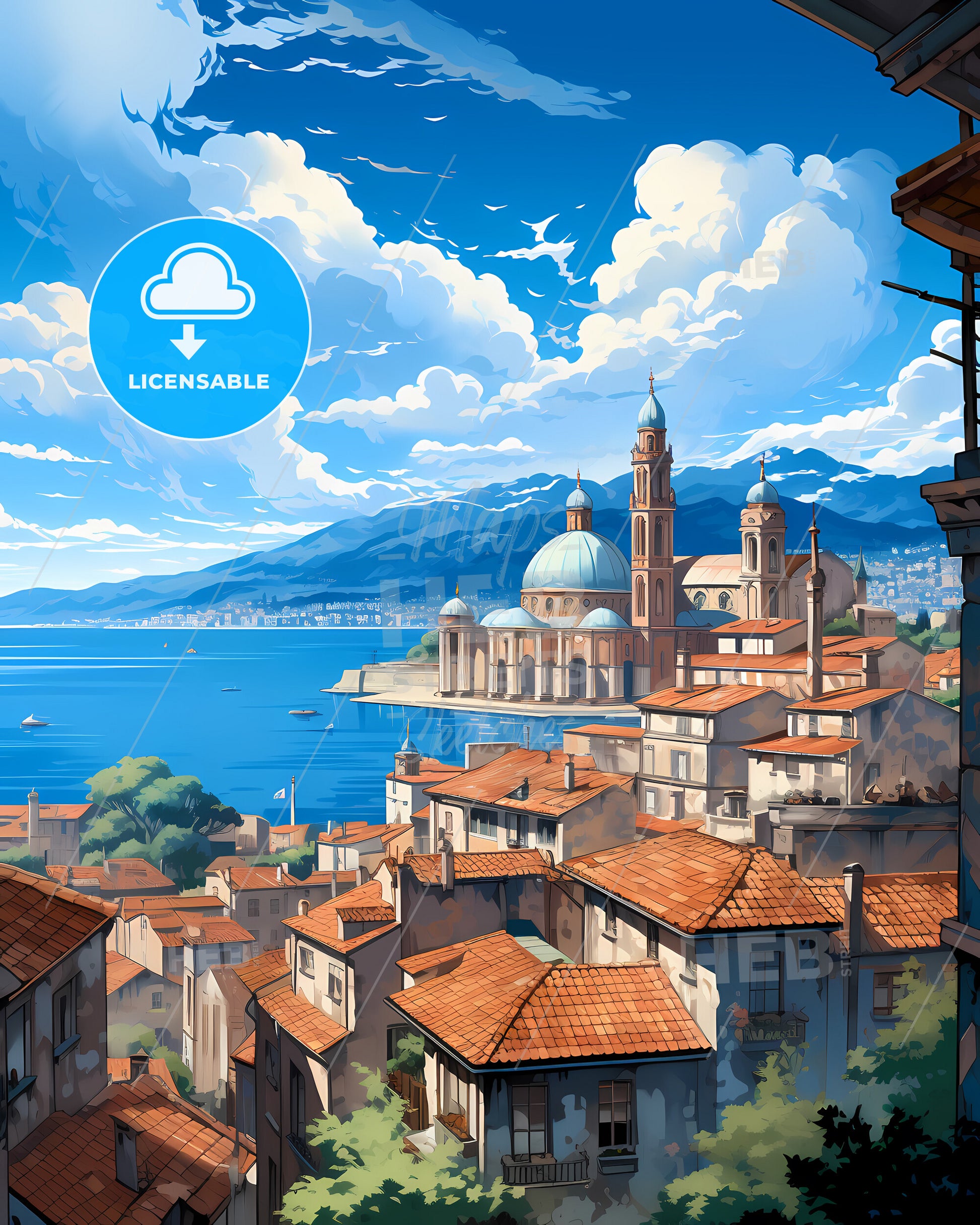 Lucerne, Switzerland, Skyline. art painting with blue sky some bright clouds in spring. in style of classic advertising illustration with nice gradients. Nice strokes and outlines that captures the playful spirit and vivid imagination of modern art.