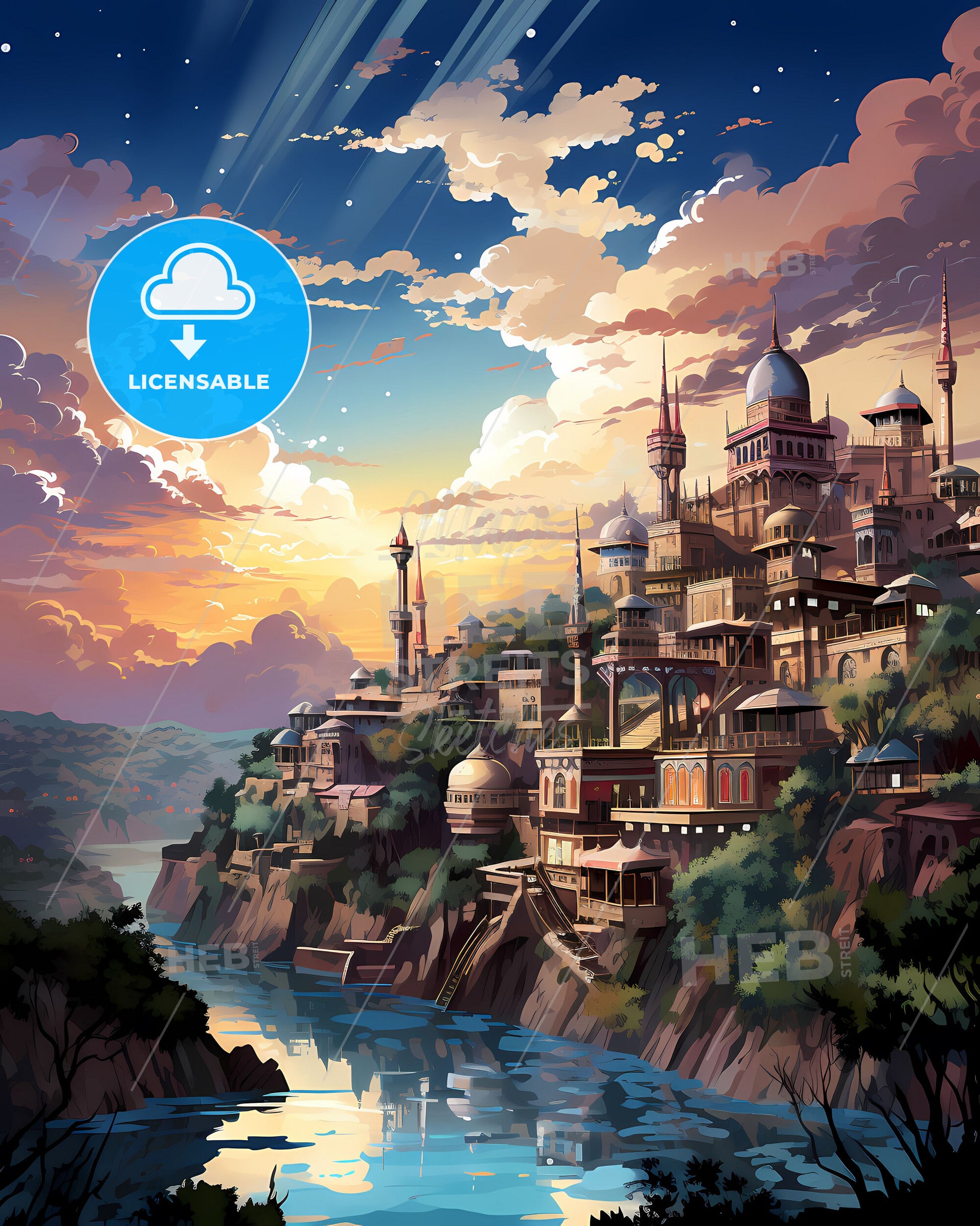 Lucknow City Skyline India Cityscape River Painting Vibrant Art