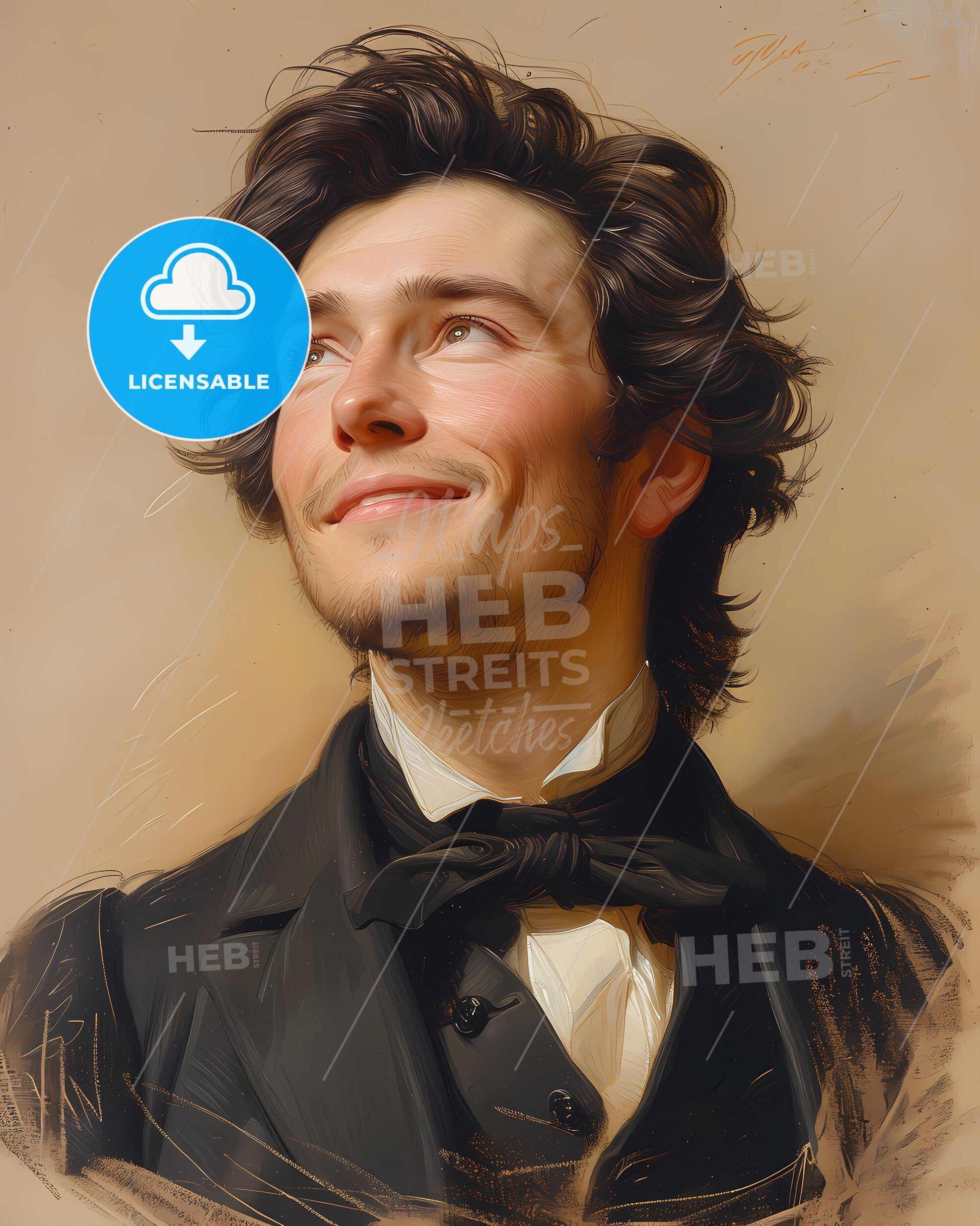 Portrait of Luigi Boccherini, 1743 - 1805, Composer, Italian composer and cellist, known for his chamber music and classical style. smiling. Vintage art illustration on bright beige paper background, sweeping overdrawn lines, subtile colored artwork, that captures the playful spirit and vivid imagination of modern art.