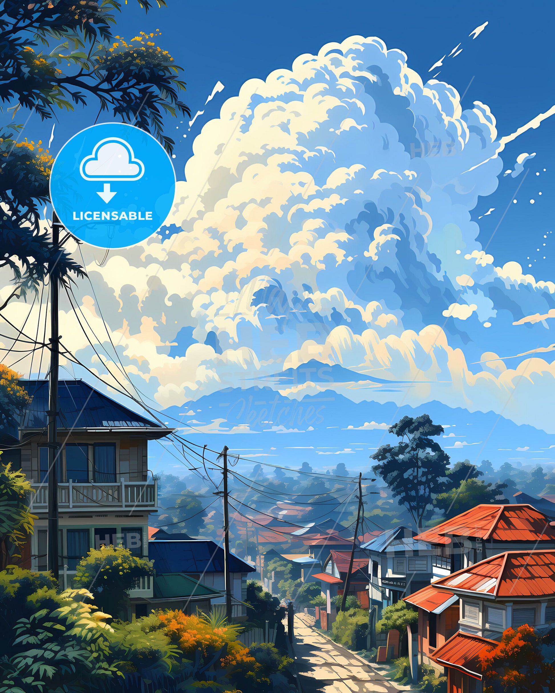 Lusaka Zambia Skyline. art painting with blue sky some bright clouds in spring. in style of classic advertising illustration with nice gradients. Nice strokes and outlines. Large area of copy space on top. litte bright sparkles