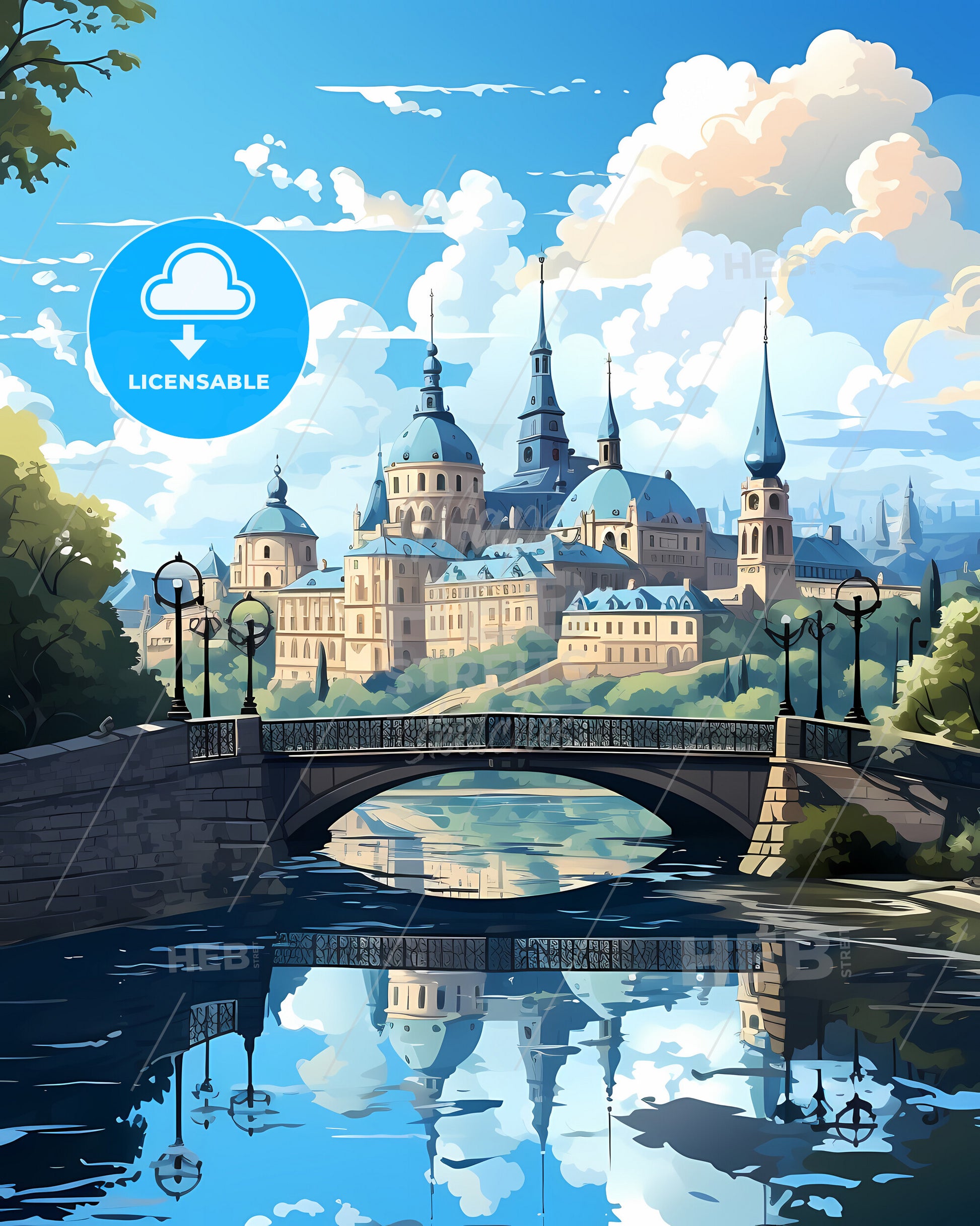Lviv, Lviv Oblast, Ukraine, Skyline. art painting with blue sky some bright clouds in spring. in style of classic advertising illustration with nice gradients. Nice strokes and outlines that captures the playful spirit and vivid imagination of modern art.