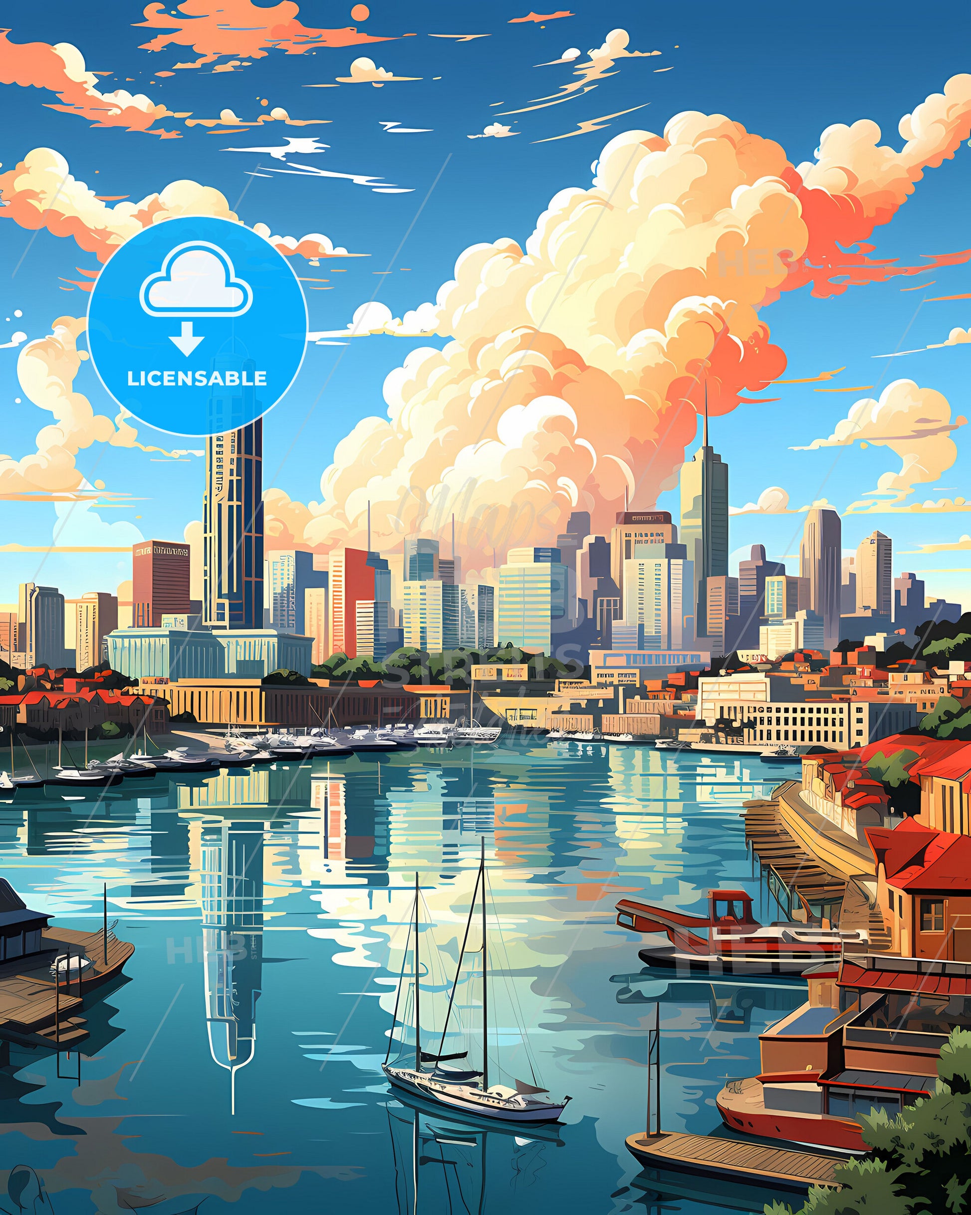 Macapa Brazil Skyline. art painting with blue sky some bright clouds in spring. in style of classic advertising illustration with nice gradients. Nice strokes and outlines. Large area of copy space on top. litte bright sparkles
