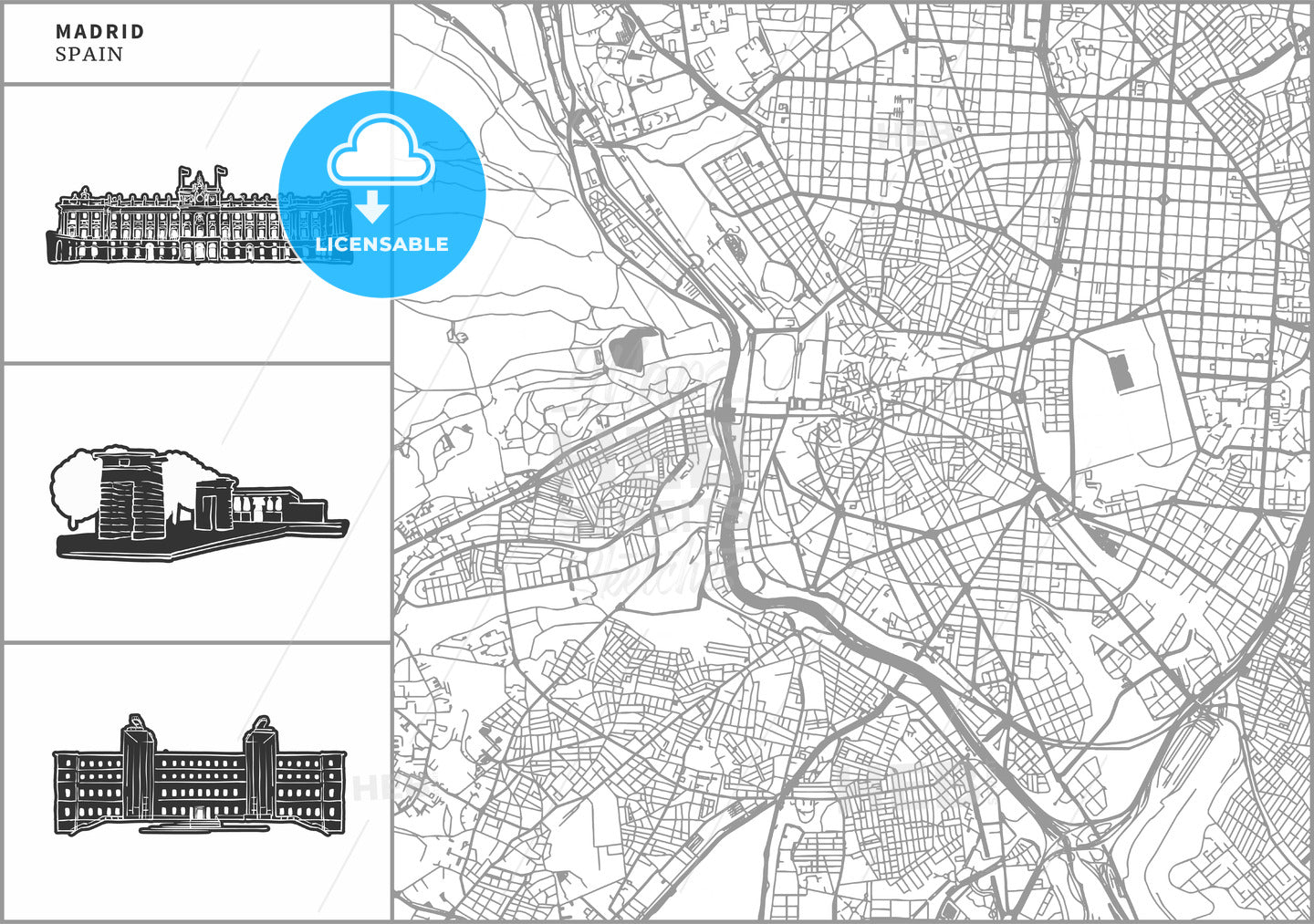 Madrid city map with hand-drawn architecture icons. All drawigns, map and background separated for easy color change. Easy repositioning in vector version.