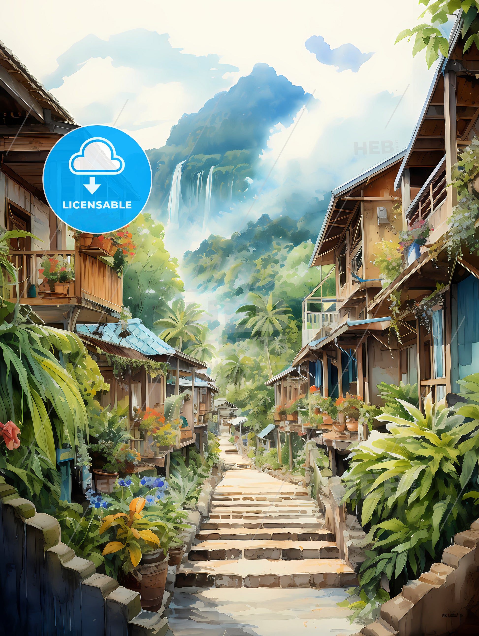 Malaysia Village In Watercolor Painting - a street with buildings and plants