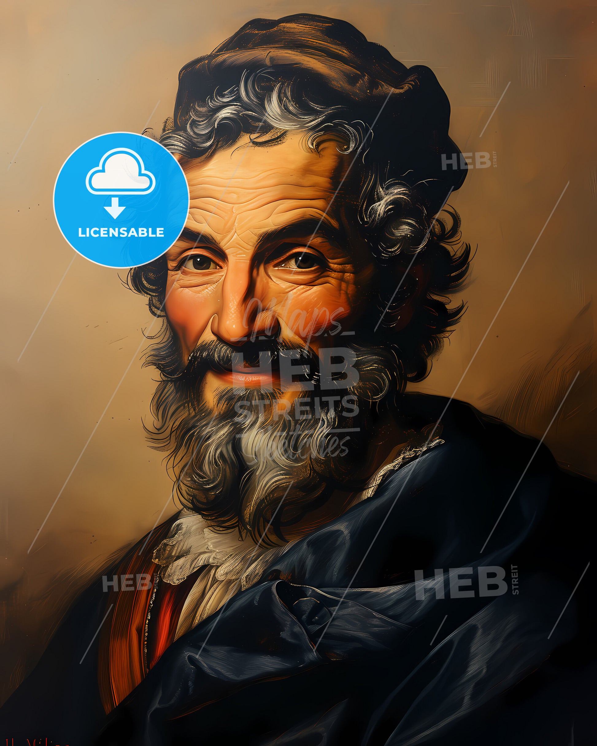Portrait of Marco Polo, 1254 - 1324, Venetian Explorer, Famous for his travels along the Silk Road and his detailed accounts of the East in "Il Milione" (The Travels of Marco Polo). smiling. Vintage art illustration on bright beige paper background - historic art style, sweeping overdrawn lines, subtile colored artwork, that captures the playful spirit and vivid imagination of modern art.