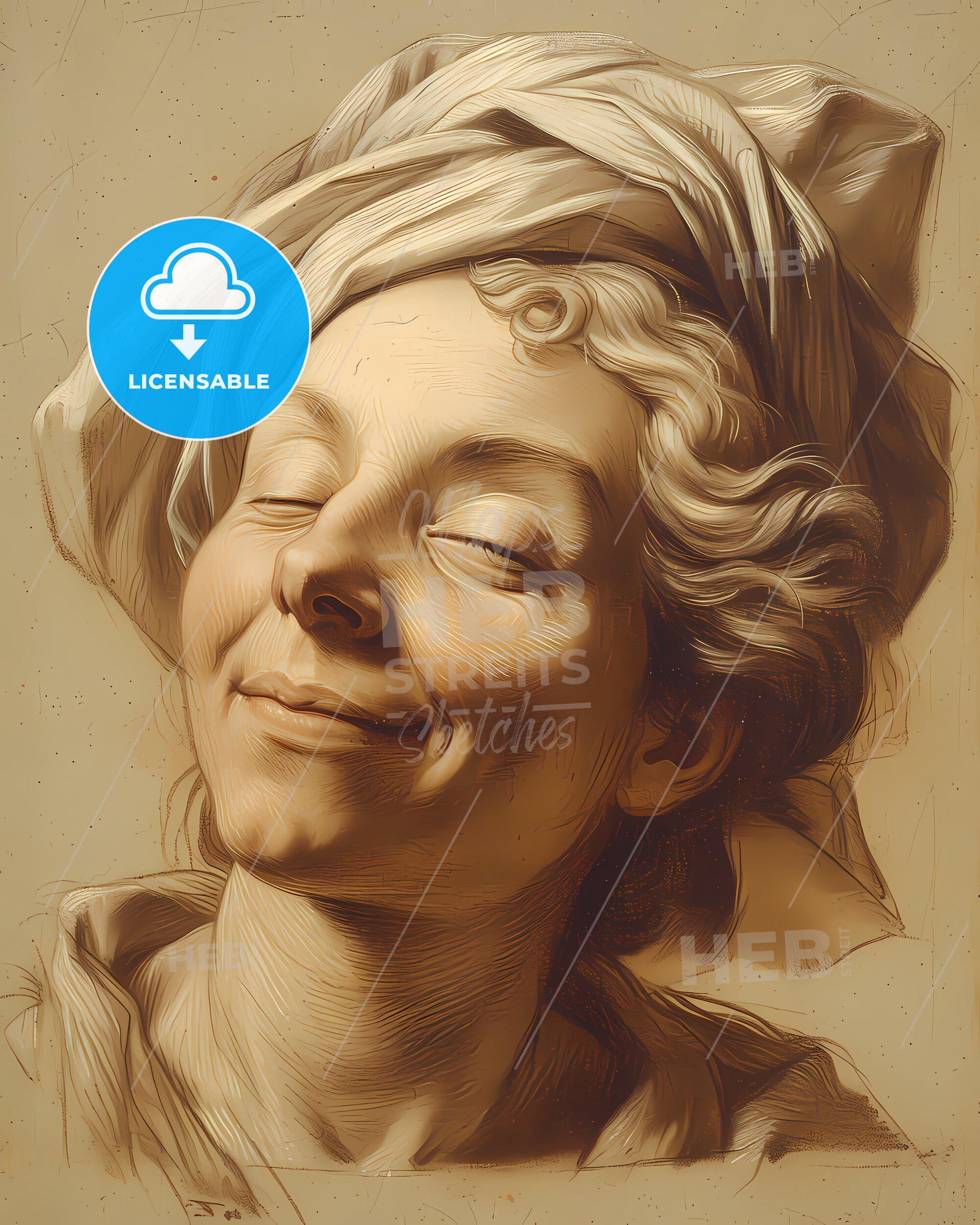 Portrait of Margaret Cavendish, 1623 - 1673, Duchess and Writer - smiling and winking. Vintage art illustration on bright beige paper background, sweeping overdrawn lines, subtile colored artwork, that captures the playful spirit and vivid imagination of modern art.