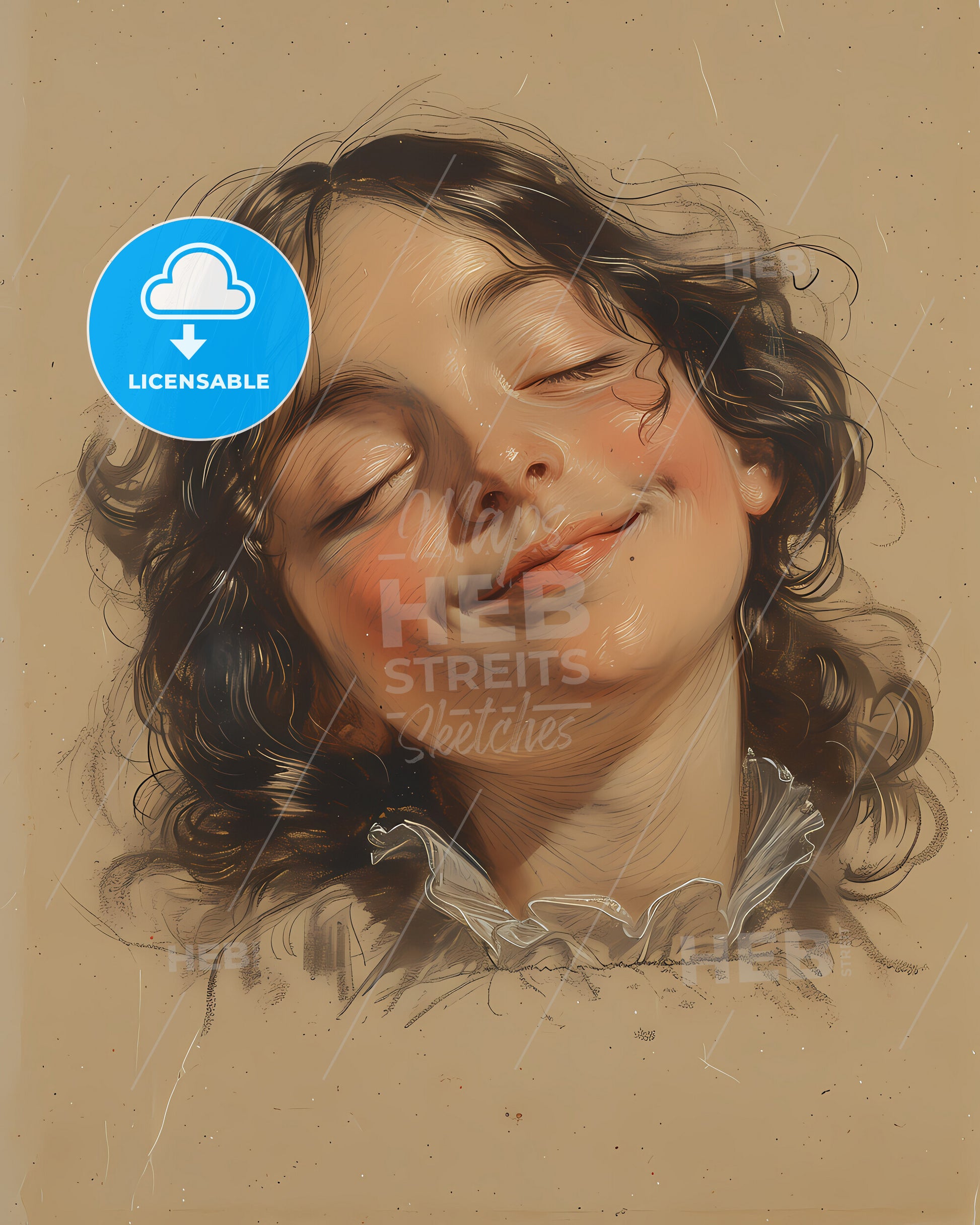 Portrait of Margaret Cavendish, 1623 - 1673, Duchess and Writer - smiling and winking. Vintage art illustration on bright beige paper background, sweeping overdrawn lines, subtile colored artwork, that captures the playful spirit and vivid imagination of modern art.