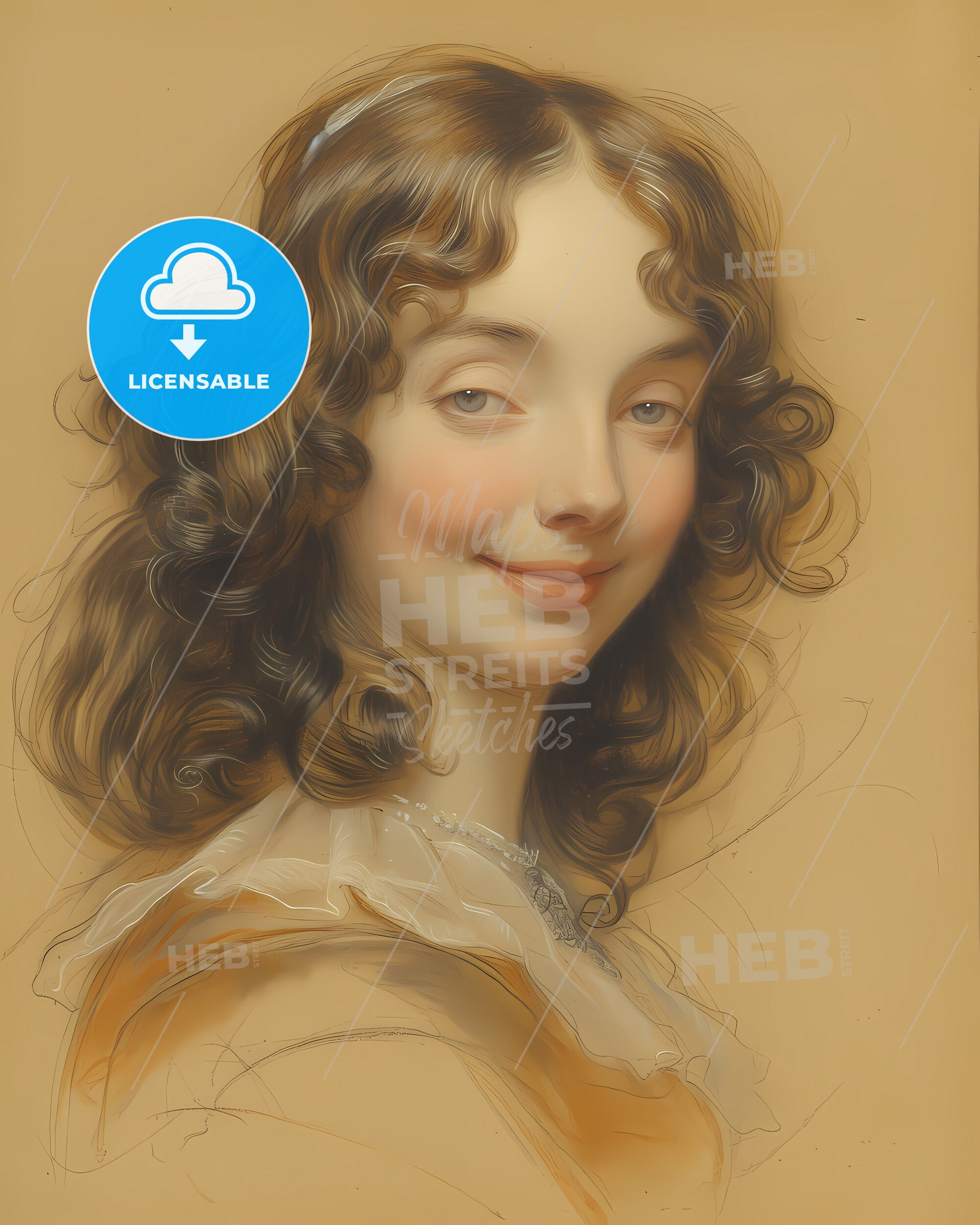 Portrait of Margaret Cavendish, 1623 - 1673, Duchess and Writer - smiling and winking. Vintage art illustration on bright beige paper background, sweeping overdrawn lines, subtile colored artwork, that captures the playful spirit and vivid imagination of modern art.
