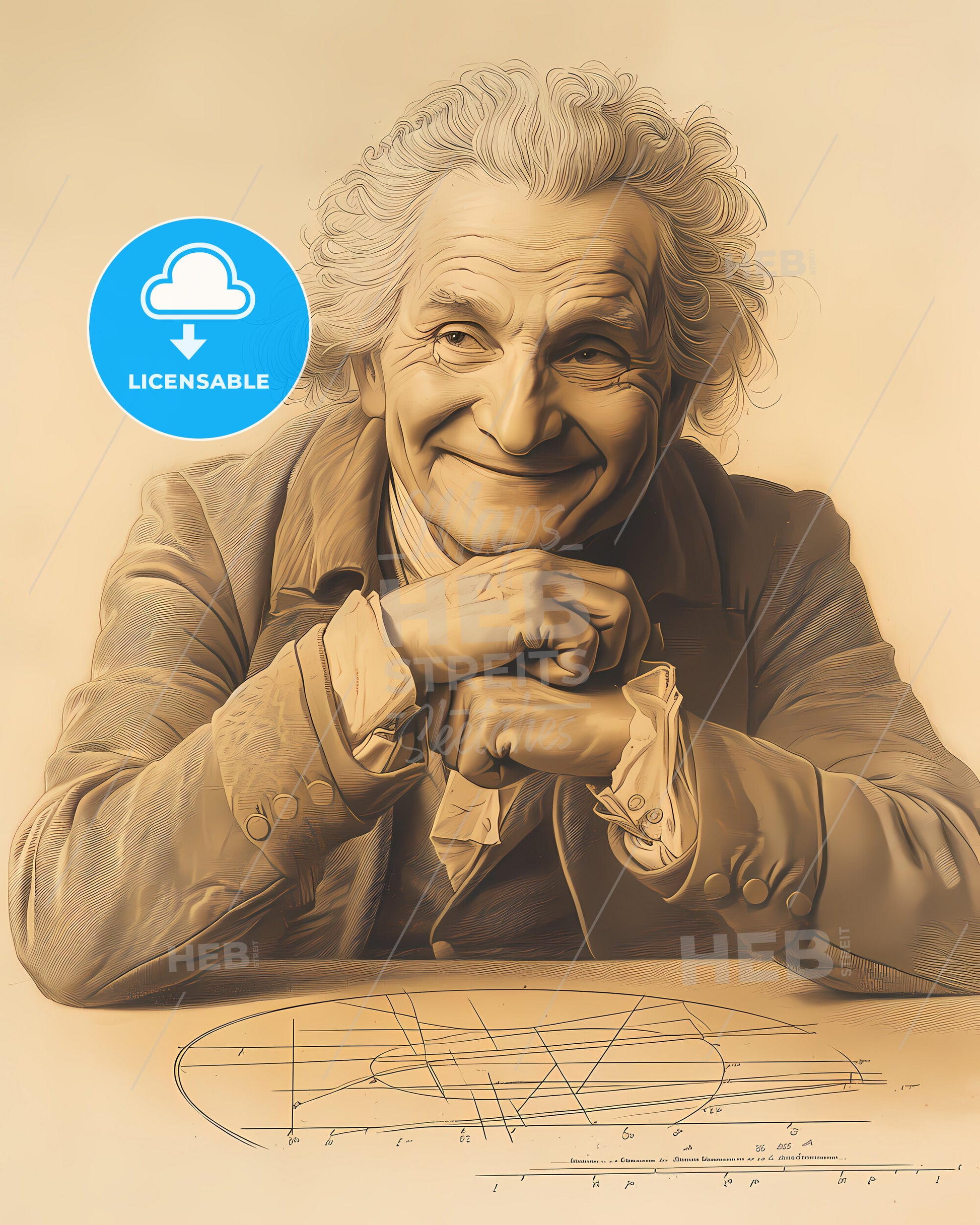 Portrait of Marin Mersenne, 1588 - 1648, Mathematician - smiling. Vintage art illustration on bright beige paper background, sweeping overdrawn lines, subtile colored artwork, that captures the playful spirit and vivid imagination of modern art.