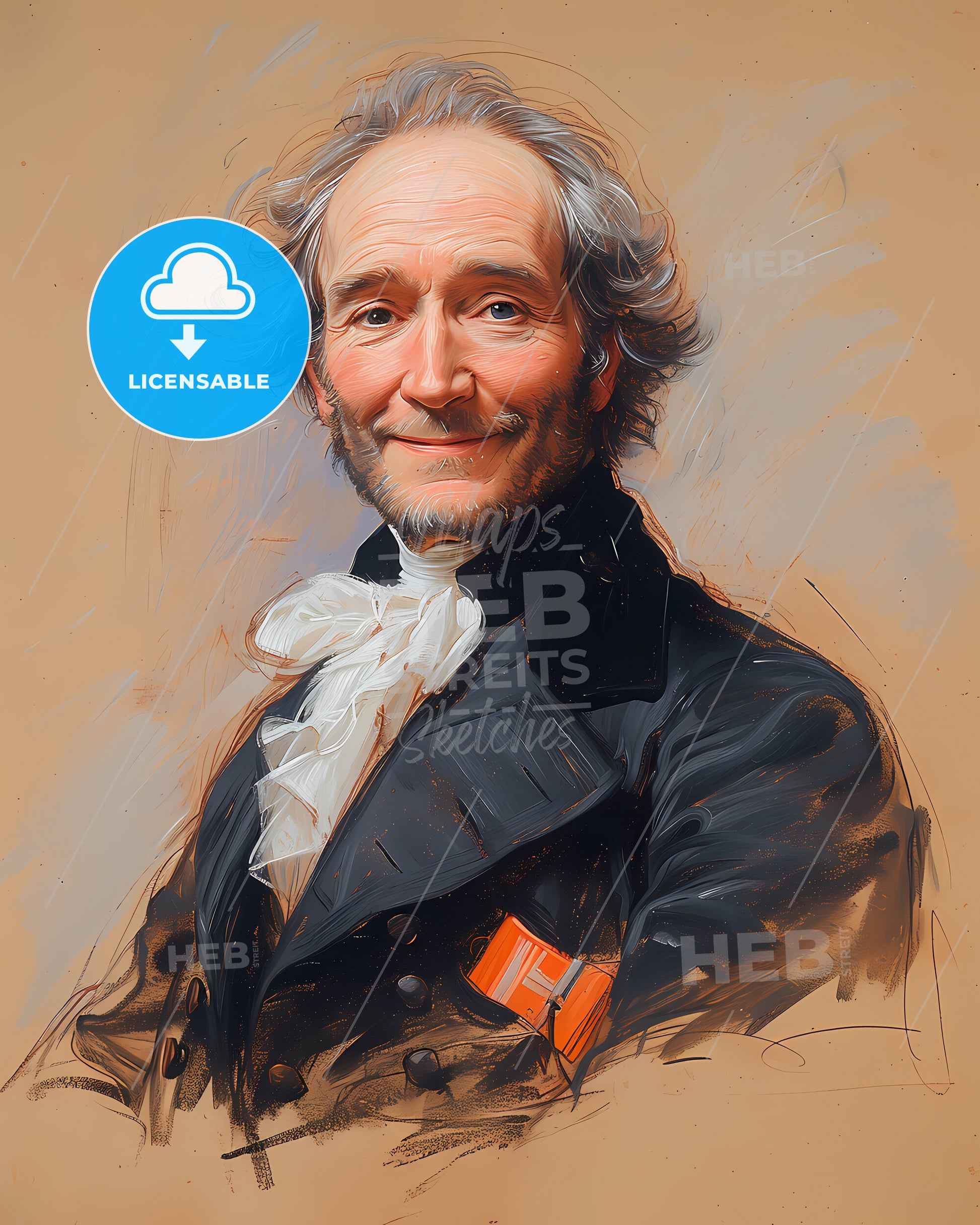 Portrait of Marquis de Lafayette, 1757 - 1834, Hero of Two Worlds, French aristocrat and military officer, fought in the American Revolutionary War and played a role in the French Revolution. smiling. Vintage art illustration on bright beige paper background, sweeping overdrawn lines, subtile colored artwork, that captures the playful spirit and vivid imagination of modern art.