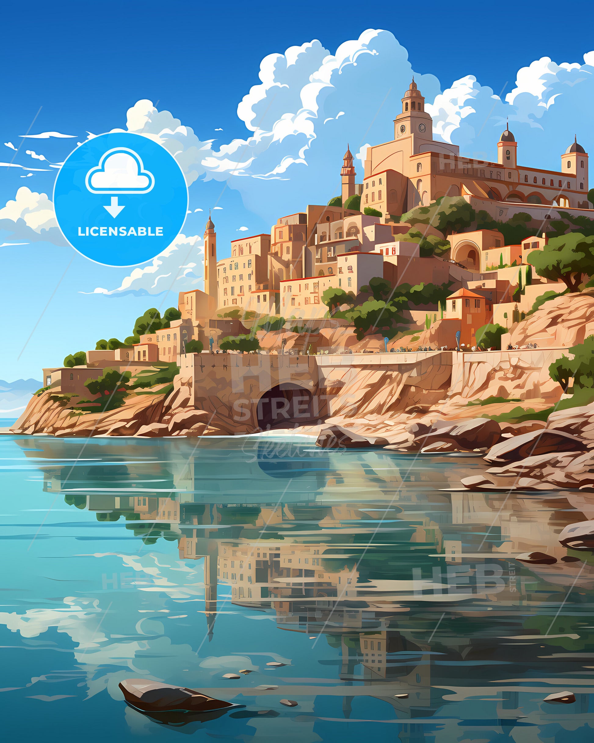 Marsala, Sicily, Italy, Skyline. art painting with blue sky some bright clouds in spring. in style of classic advertising illustration with nice gradients. Nice strokes and outlines that captures the playful spirit and vivid imagination of modern art.