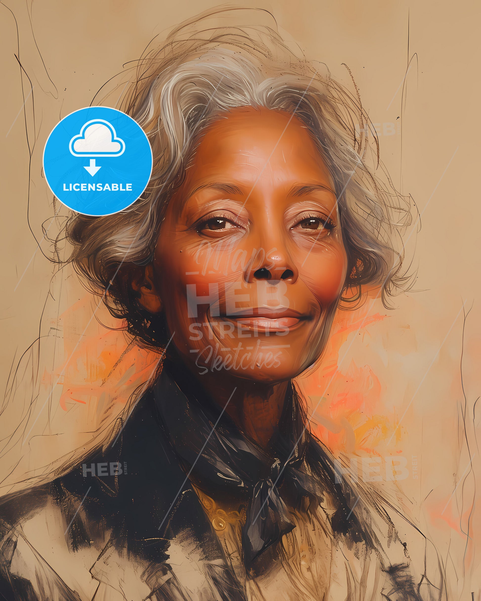 Portrait of Mary Ann Shadd Cary, 1823 - 1893, Abolitionist and Journalist, First African American woman to edit and publish a newspaper in North America. smiling. Vintage art illustration on bright beige paper background, sweeping overdrawn lines, subtile colored artwork, that captures the playful spirit and vivid imagination of modern art.