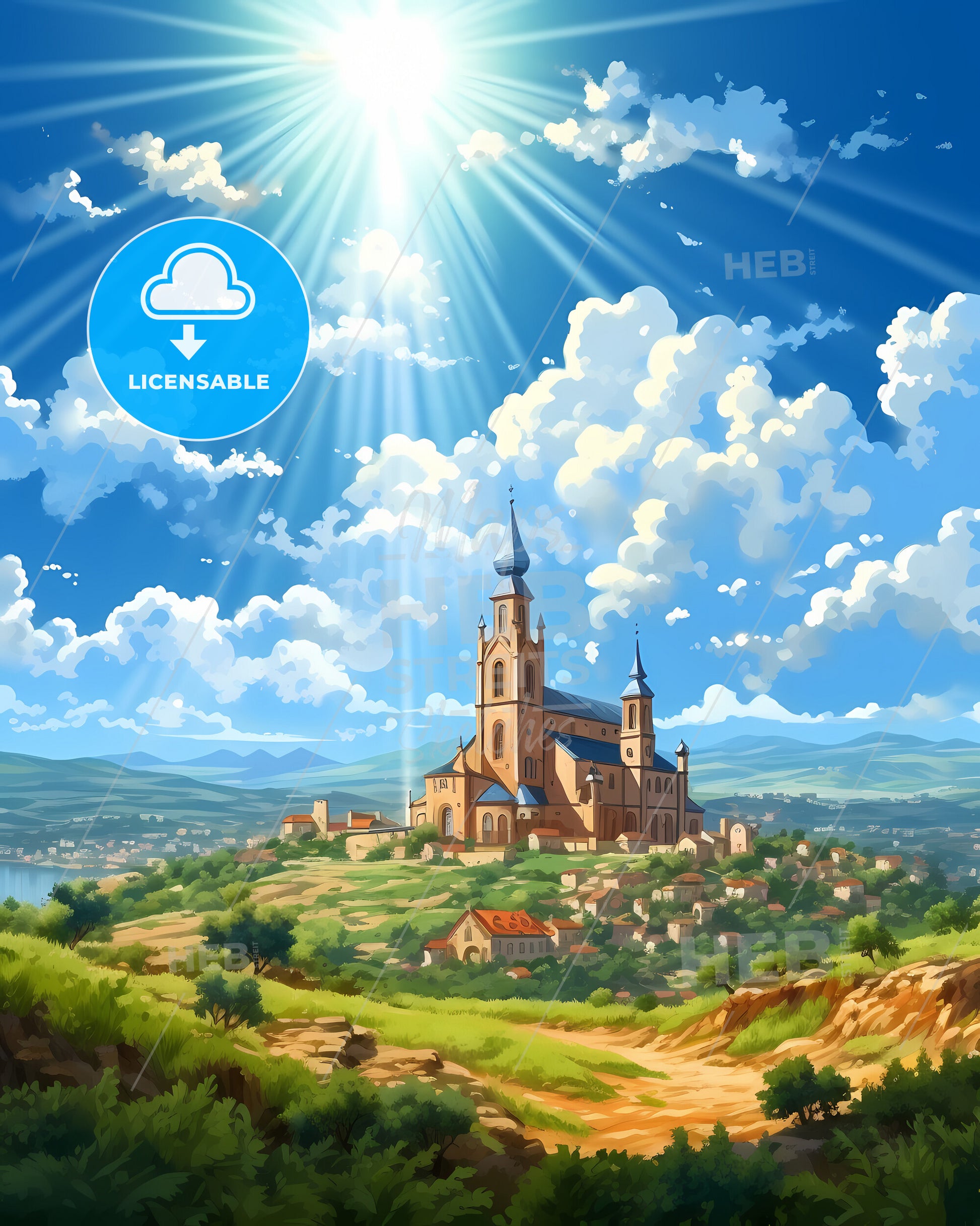 Mazara del Vallo, Sicily, Italy, Skyline. art painting with blue sky some bright clouds in spring. in style of classic advertising illustration with nice gradients. Nice strokes and outlines that captures the playful spirit and vivid imagination of modern art.