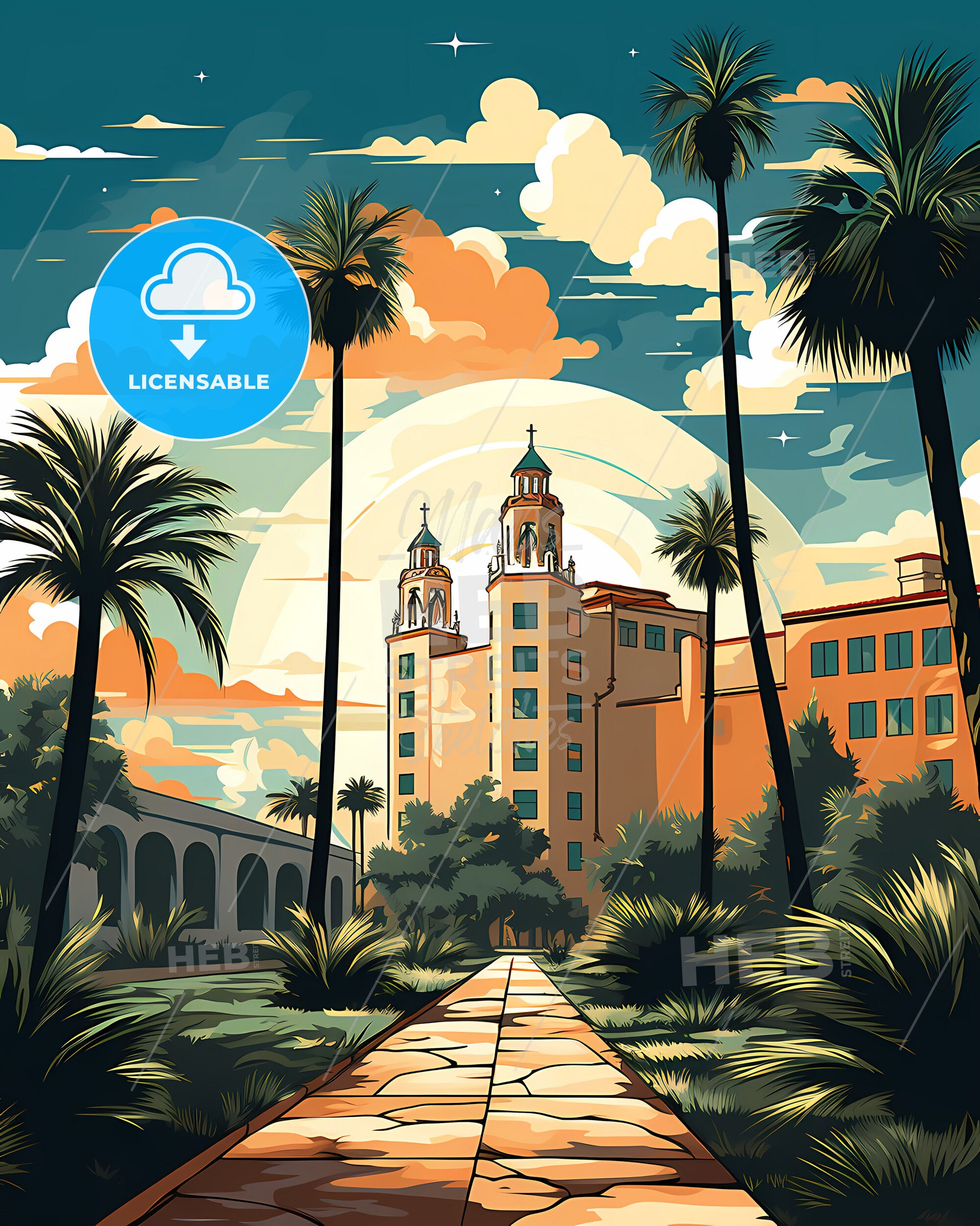 McAllen, Texas, Skyline. art painting with blue sky some bright clouds in spring. in style of classic advertising illustration with nice gradients. Nice strokes and outlines that captures the playful spirit and vivid imagination of modern art.