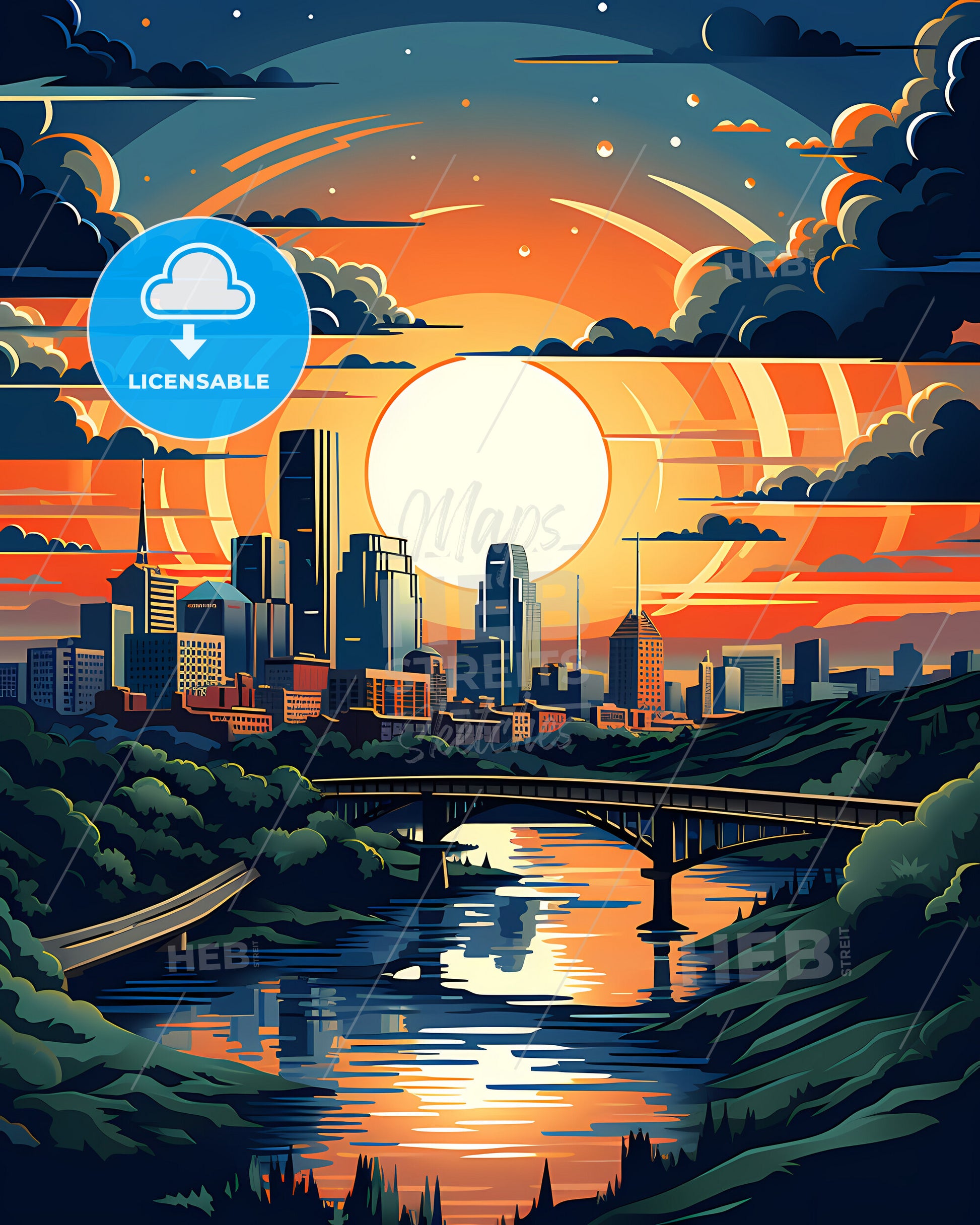 McKinney, Texas, Skyline. art painting with blue sky some bright clouds in spring. in style of classic advertising illustration with nice gradients. Nice strokes and outlines that captures the playful spirit and vivid imagination of modern art.