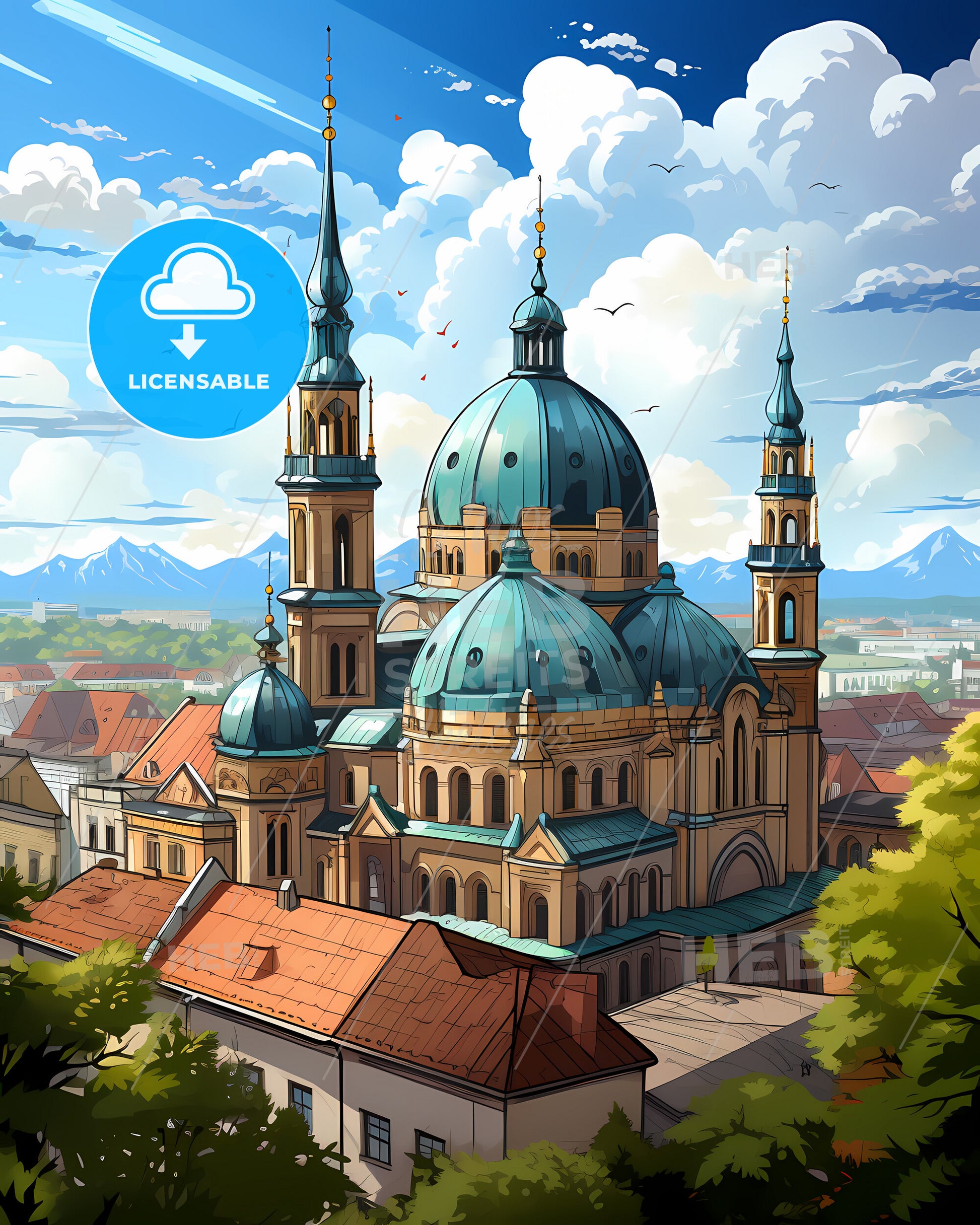 Milan, Lombardy, Italy, Skyline. art painting with blue sky some bright clouds in spring. in style of classic advertising illustration with nice gradients. Nice strokes and outlines that captures the playful spirit and vivid imagination of modern art.