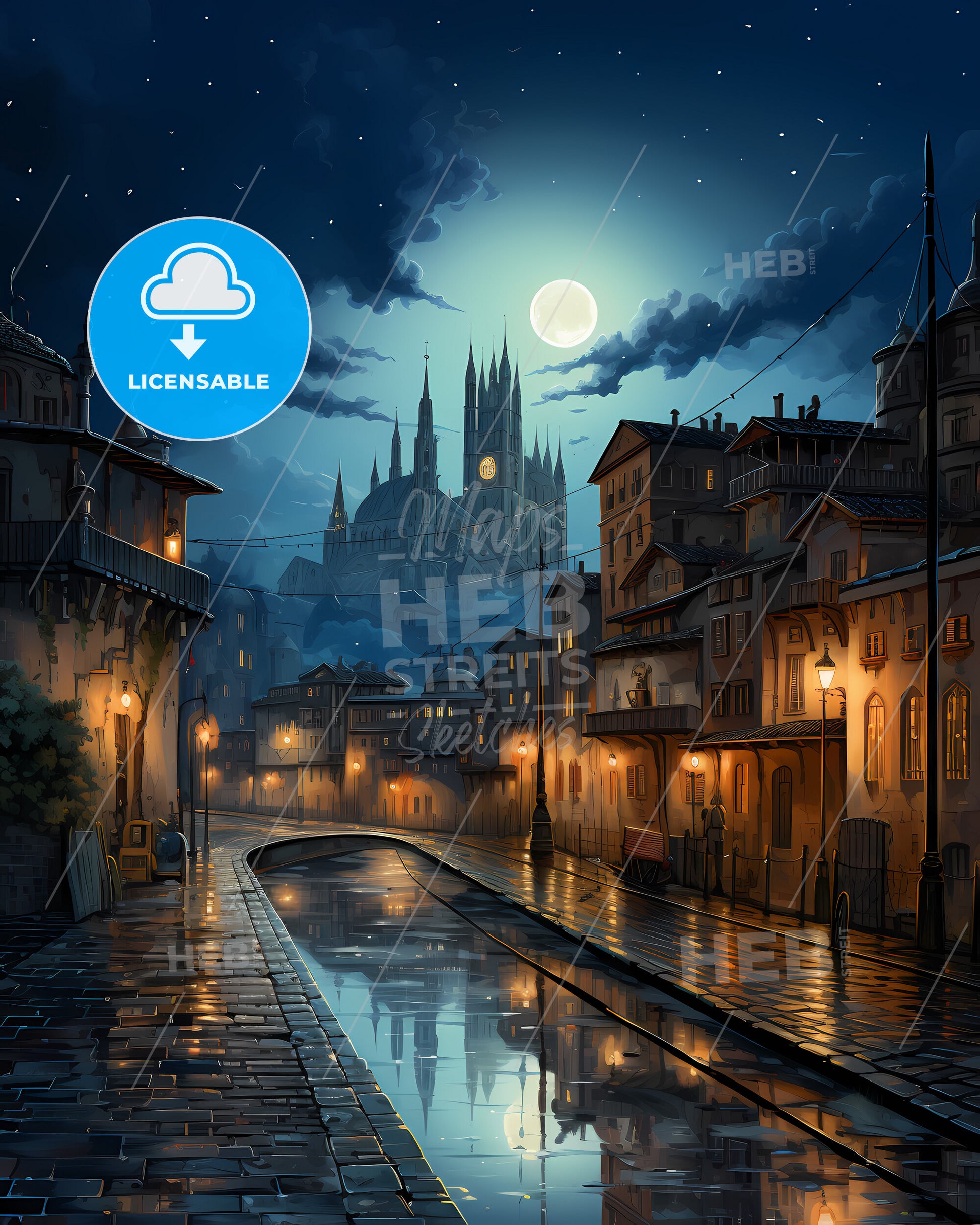 Milan, Lombardy, Italy, Skyline. art painting with blue sky some bright clouds in spring. in style of classic advertising illustration with nice gradients. Nice strokes and outlines that captures the playful spirit and vivid imagination of modern art.
