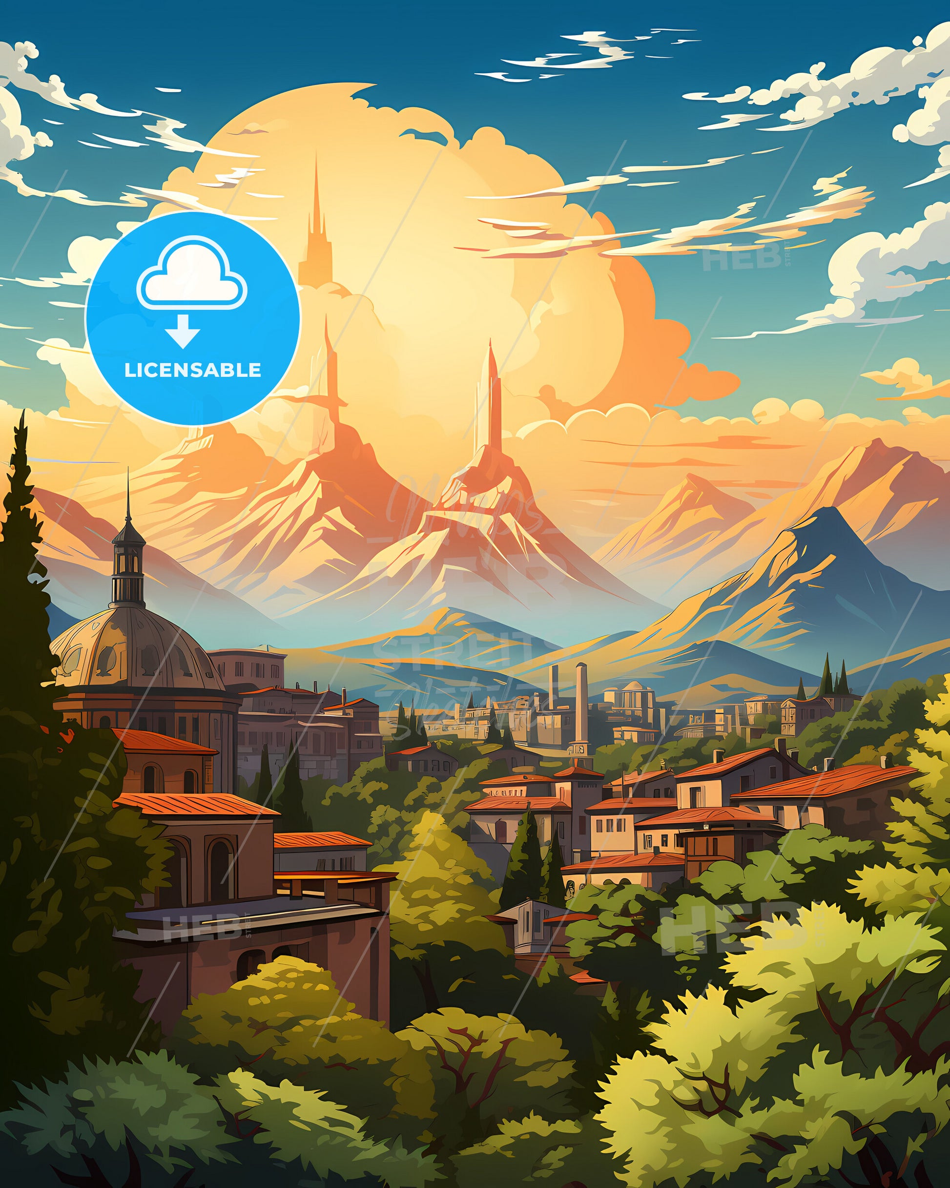 Milan, Lombardy, Italy, Skyline. art painting with blue sky some bright clouds in spring. in style of classic advertising illustration with nice gradients. Nice strokes and outlines that captures the playful spirit and vivid imagination of modern art.