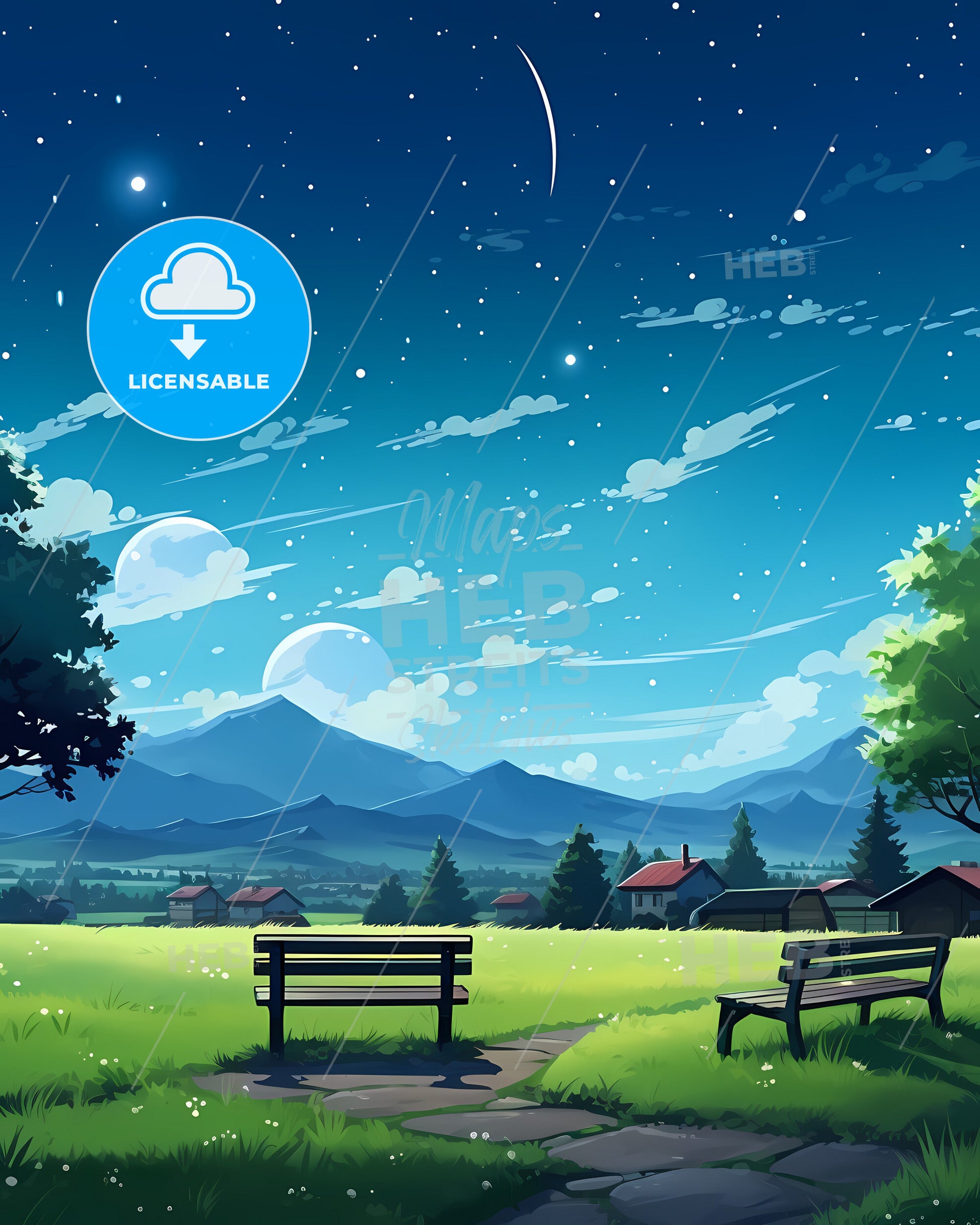 Missoula, Montana, a landscape of a green field with benches and trees and houses