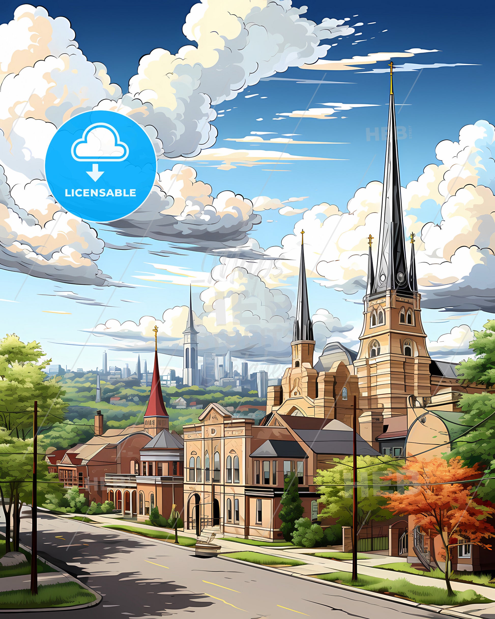 Murfreesboro, Tennessee, Skyline. art painting with blue sky some bright clouds in spring. in style of classic advertising illustration with nice gradients. Nice strokes and outlines that captures the playful spirit and vivid imagination of modern art.