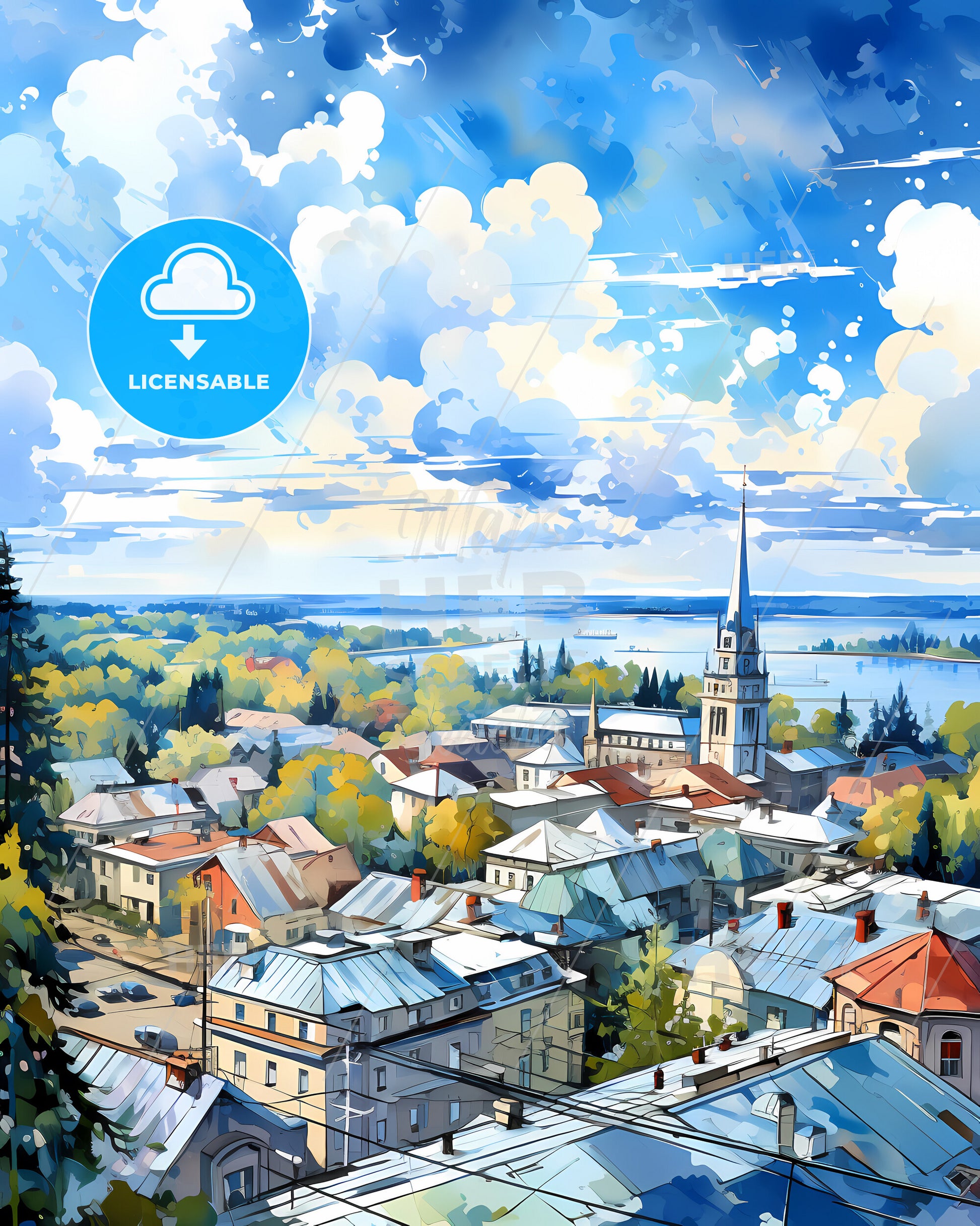 Mykolaiv, Mykolaiv Oblast, Ukraine, Skyline. art painting with blue sky some bright clouds in spring. in style of classic advertising illustration with nice gradients. Nice strokes and outlines that captures the playful spirit and vivid imagination of modern art.