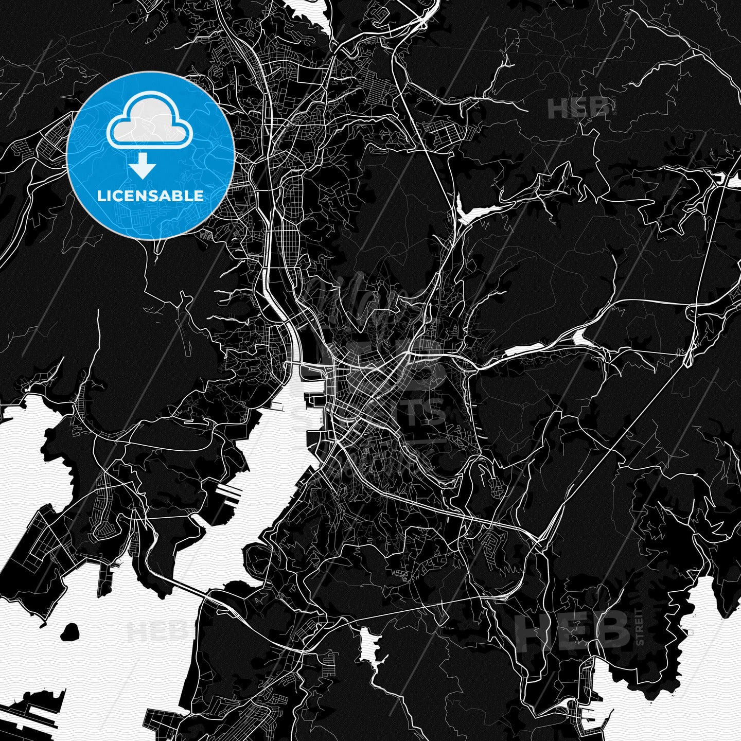 Black and white vector map of Nagasaki, Nagasaki, Japan with fine structures and patterns for download. This printable map of Nagasaki with major and minor roads has been carefully designed for all personal and professional needs. The pure PDF vector version of this map is fully scalable. Depending on our license, you can use this map for websites, marketing background and wall art.