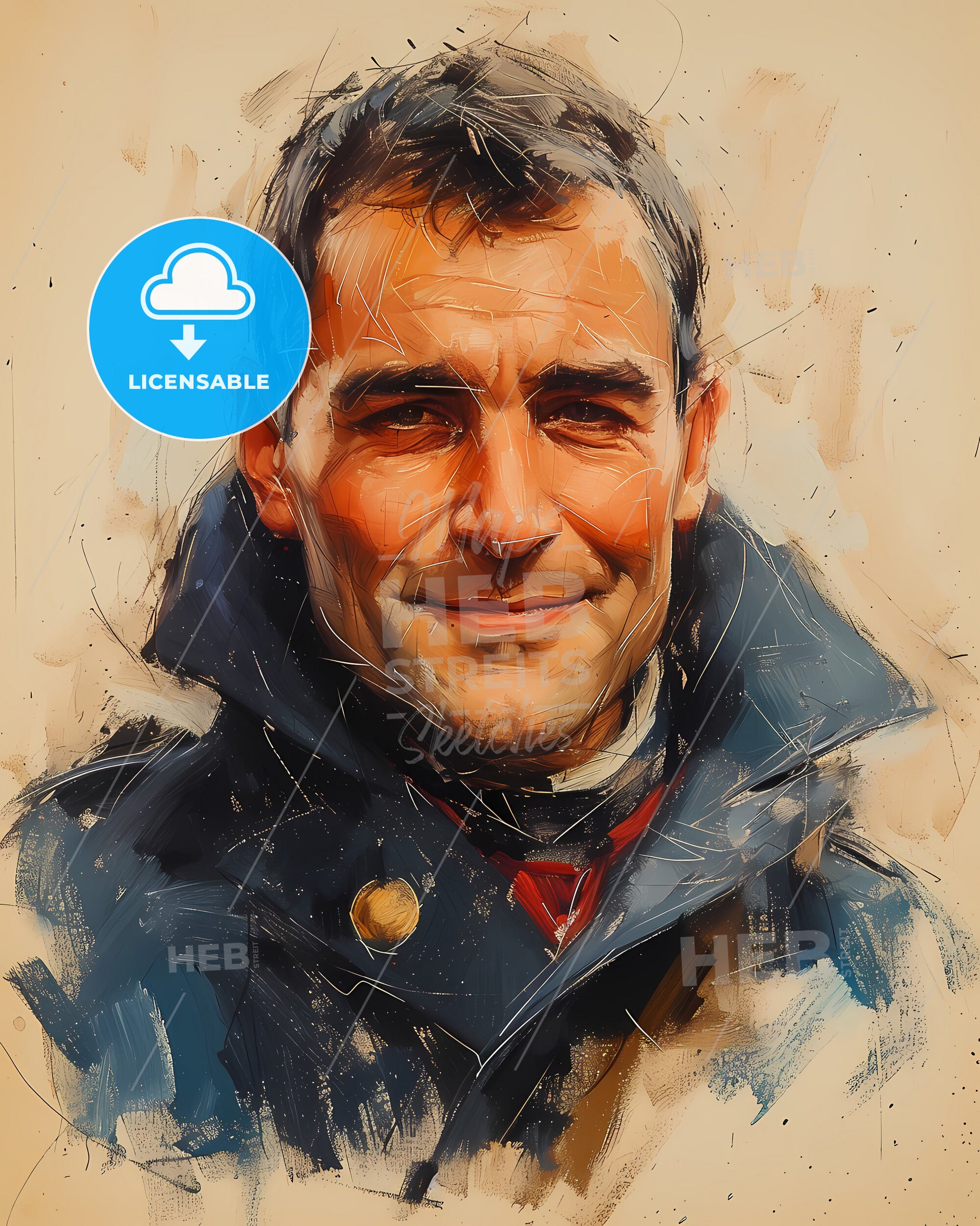 Portrait of Napoleon Bonaparte, 1769 - 1821, Military and Political Leader, French military general and emperor who rose to prominence during the French Revolution. smiling. Vintage art illustration on bright beige paper background, sweeping overdrawn lines, subtile colored artwork, that captures the playful spirit and vivid imagination of modern art.