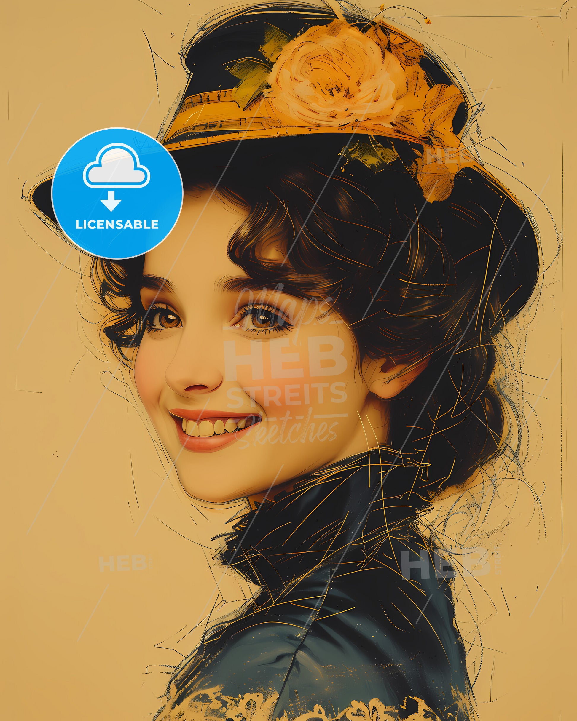 Portrait of Nellie Melba, 1861 - 1931, Soprano, Australian opera singer, one of the most famous sopranos of the late 19th and early 20th smiling. Vintage art illustration on bright beige paper background, sweeping overdrawn lines, subtile colored artwork, that captures the playful spirit and vivid imagination of modern art.