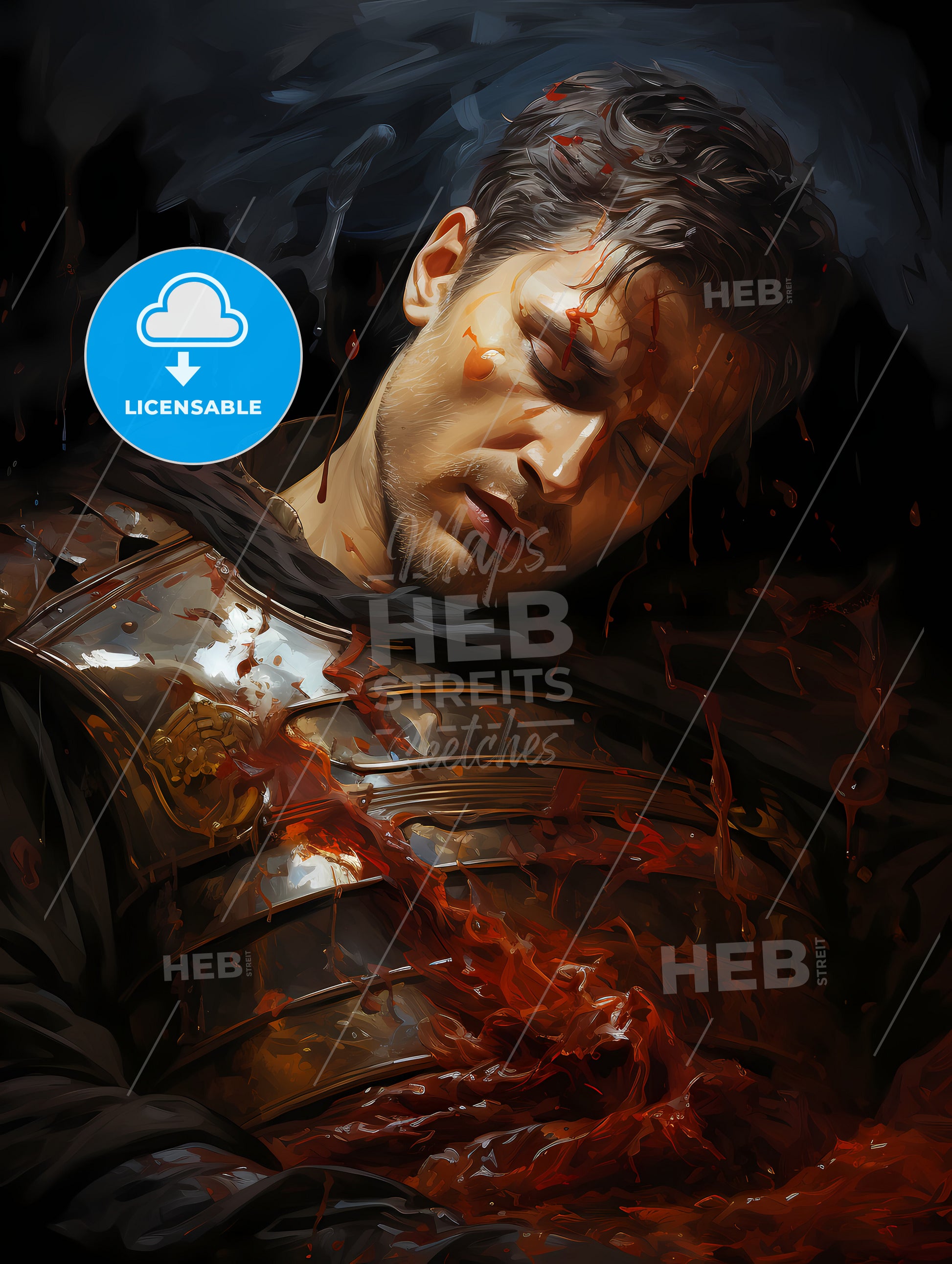 Nero Kills Kleopatra - a man lying down with blood on his chest - Nero kills Kleopatra, acrylic painting, hand-painted strokes, line-art, art print, poster, unframed, framed, high quality, gift, interior decor, home decor, colorful, vibrant, unique, artistic, historical, Roman emperor, Egyptian queen, historical event, ancient history, iconic moment, mythology, famous artwork, wall decor, wall art, original print, painting reproduction, collectible, timeless, expressive, eye-catching, statement piece, conversation starter, art enthusiasts, history lovers, European history, Egyptian civilization, royal figures, classical art, mythological figures, mythological art, extraordinary, one-of-a-kind, artistic masterpiece.