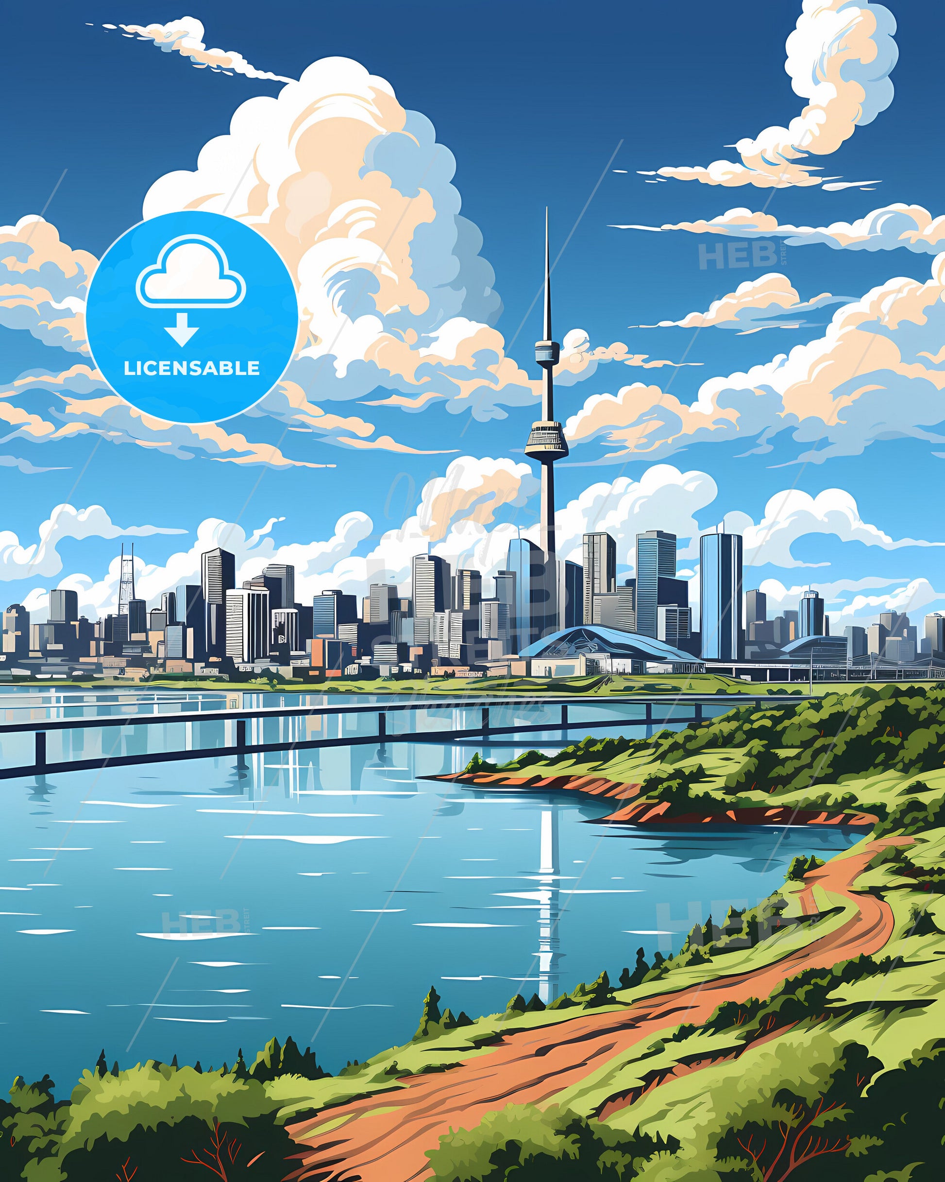 Vibrant Art Deco City Skyline Painting, Niteroi Brazil, Bridge Over Water