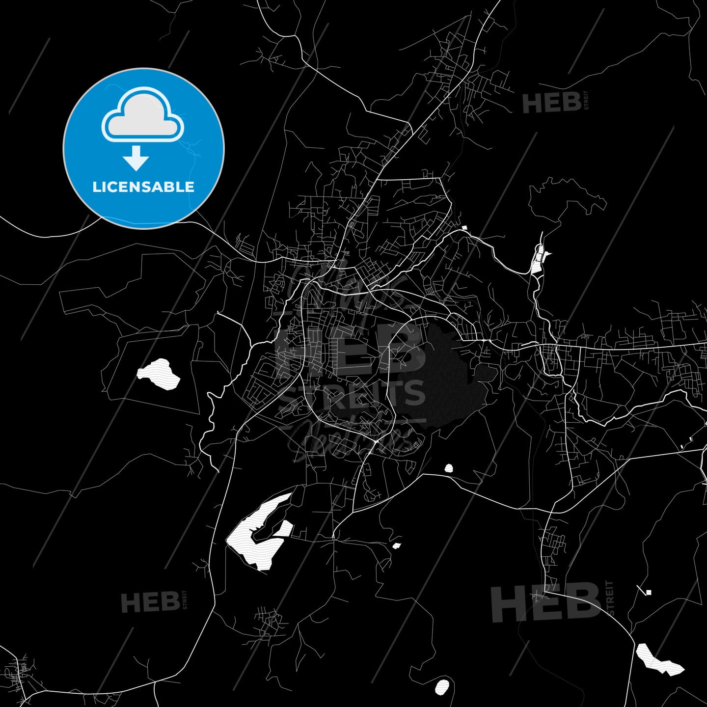 Black and white vector map of Obuase, Ghana with fine structures and patterns for download. This printable map of Obuase with major and minor roads has been carefully designed for all personal and professional needs. The pure PDF vector version of this map is fully scalable. Depending on our license, you can use this map for websites, marketing background and wall art.