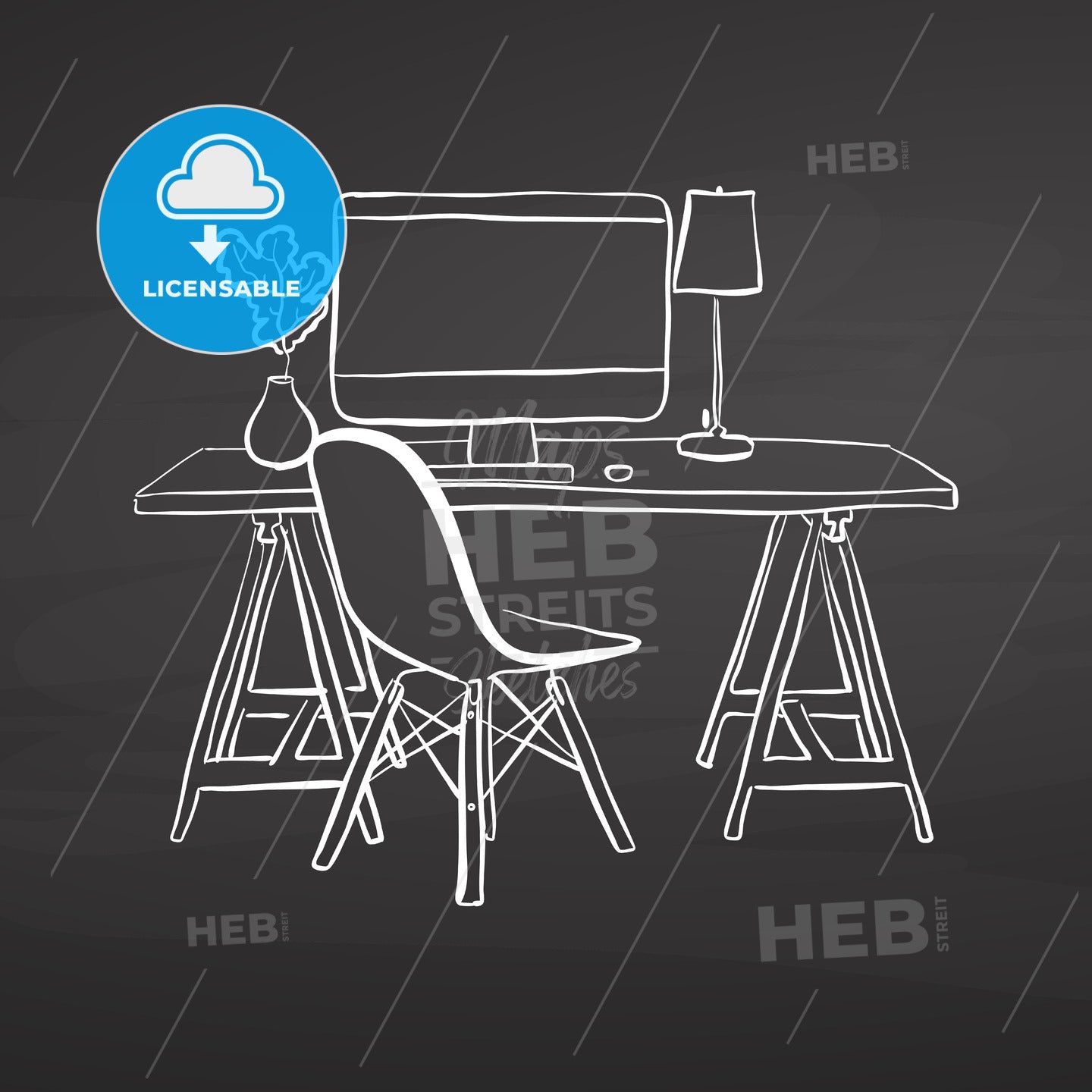 office desk drawing on chalkboard. hand-drawn vector sketch. business concept design.