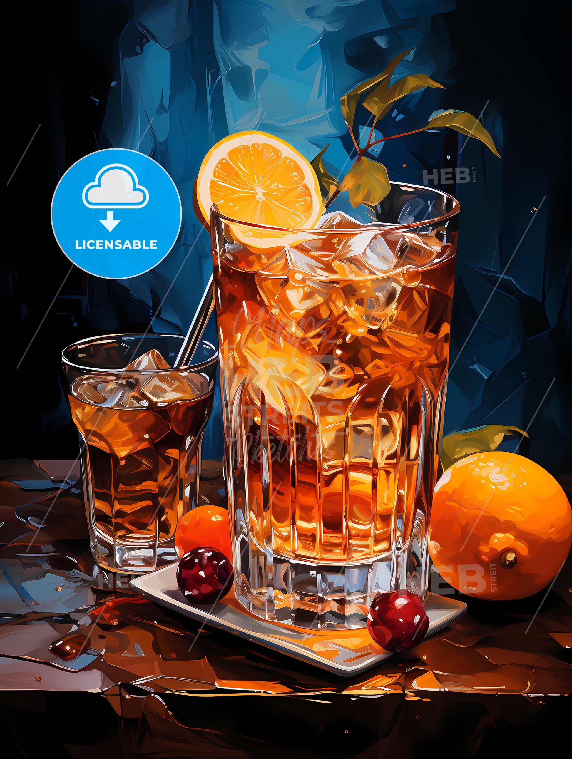 Old Fashioned Cocktail - a glass of ice tea with orange slices and cherries